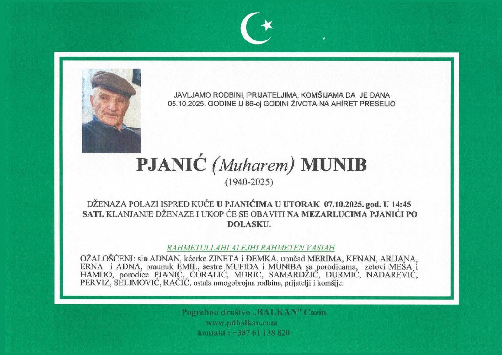 DŽENAZA POLAZI ISPRED KUĆE U PJANIĆIMA U UTORAK 07.10.2025. god. U 14:45 SATI.