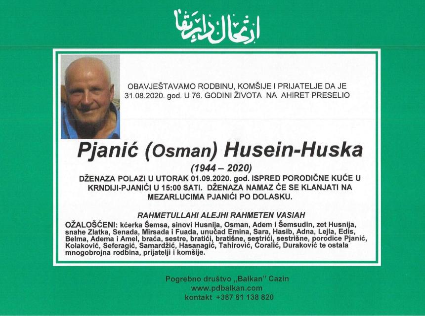 Tužnog srca i s bolom u duši obavještavamo rodbinu, komšije i prijatelje da je naš dragi Pjanić (Osman) Husein-Huska, dana 31.08.2020. godine, u 76-oj. godini života, preselio na Ahiret.