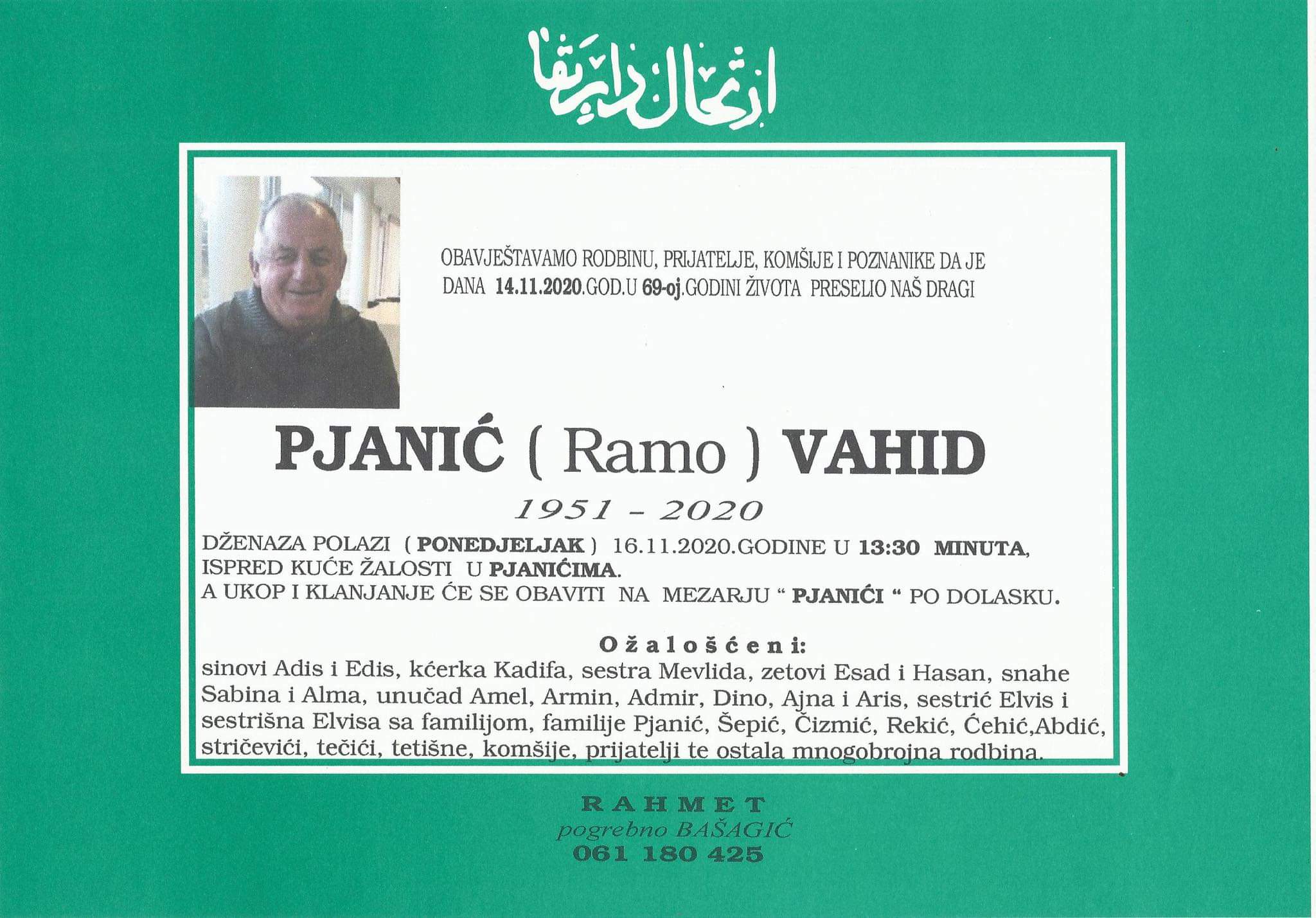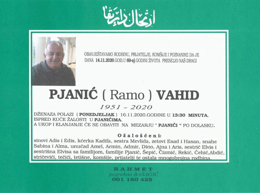 Tužnog srca i s bolom u duši obavještavamo rodbinu, komšije i prijatelje da je naš dragi Pjanić (Ramo) Vahid, dana 14.11.2020. godine, u 69-oj godini života, preselio na Ahiret