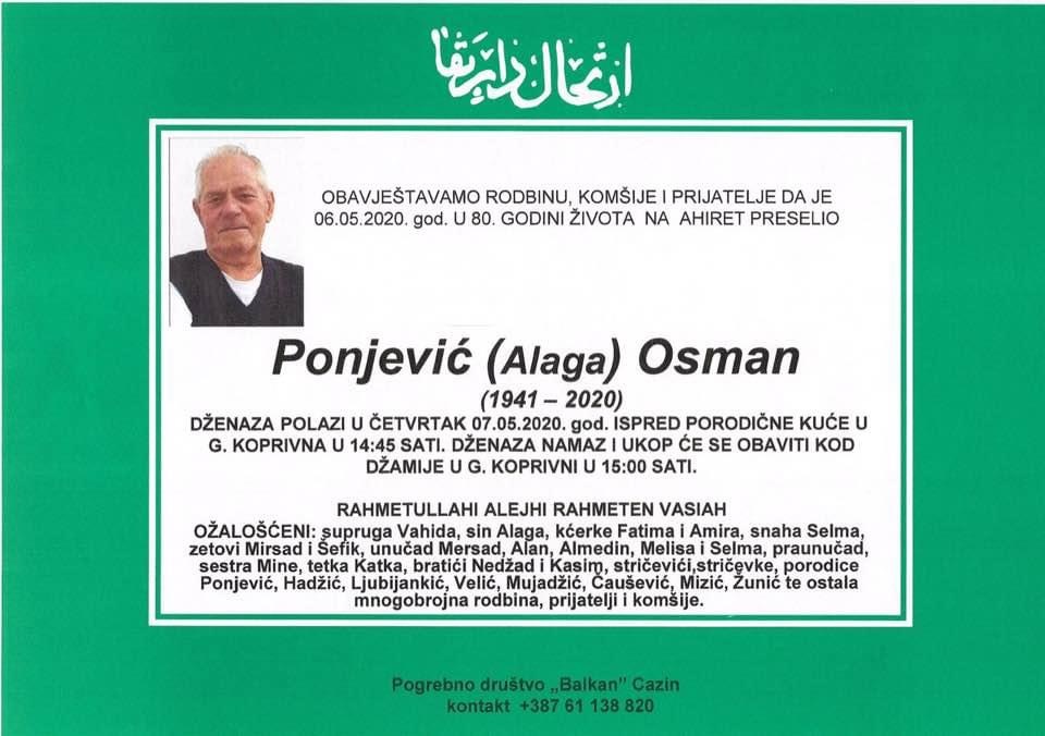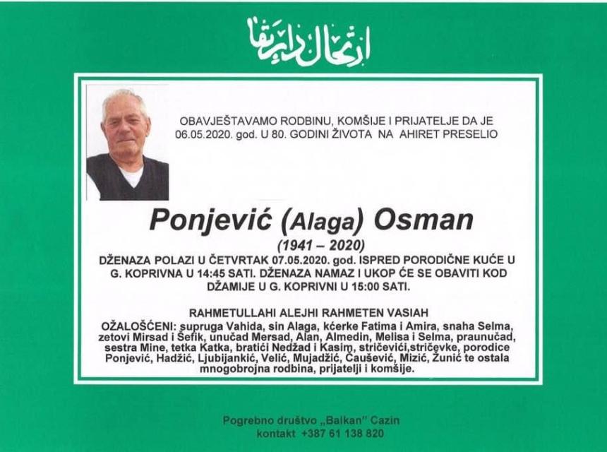 Tužnog srca i s bolom u duši javljamo rodbini, komšijama i prijateljima da je naš dragi Ponjević (Alaga) Osman, dana 06.05. 2020. godine u 80-oj godini života preselio na Ahiret.