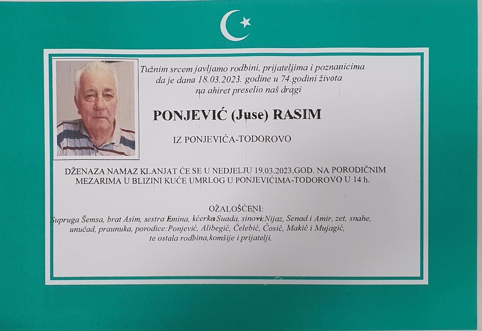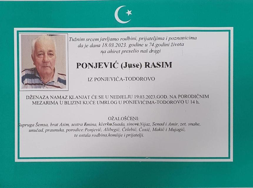 Tužnim srcem i bolom u duši javljamo rodbini, prijateljima i komšijama da je naš dragi Ponjević (Juse) Rasim, dana 18.03.2023. godine u 74-oj godini života, preselio na Ahiret.