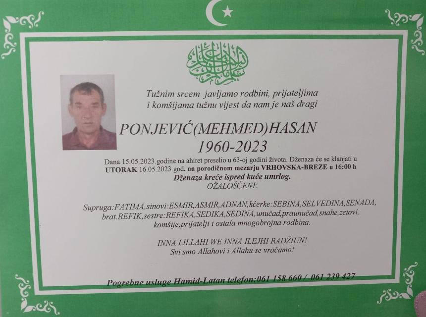 Tužnim srcem i bolom u duši javljamo rodbini, prijateljima i komšijama da je naš dragi Ponjević (Mehmed) Hasan, dana 15.05.2023. godine u 63-oj godini života, preselio na Ahiret.