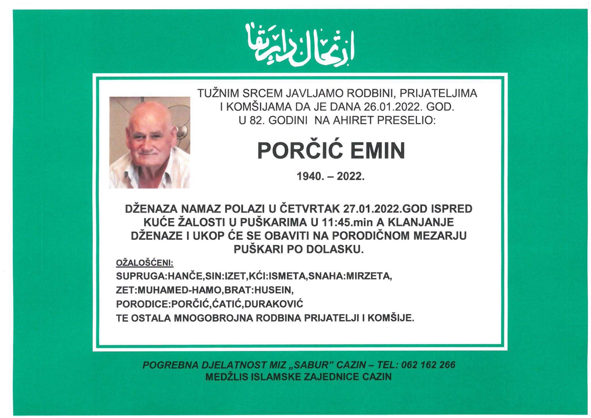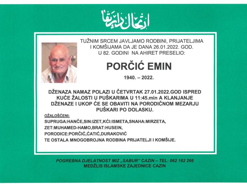 Tužnog srca i s bolom u duši obavještavamo rodbinu, komšije i prijatelje da je naš dragi Porčić Emin, dana 26.01.2022. godine, u 82-oj godini života, preselio na Ahiret.
