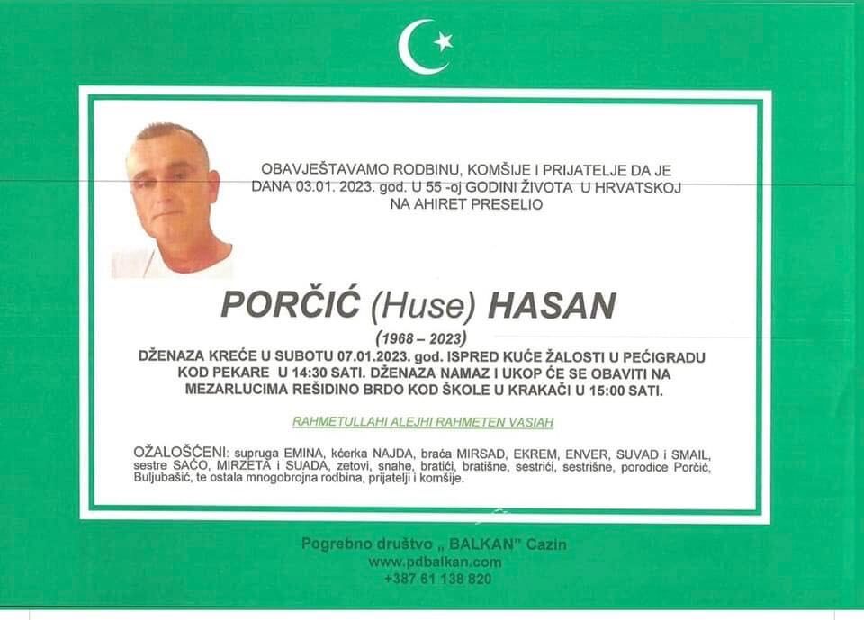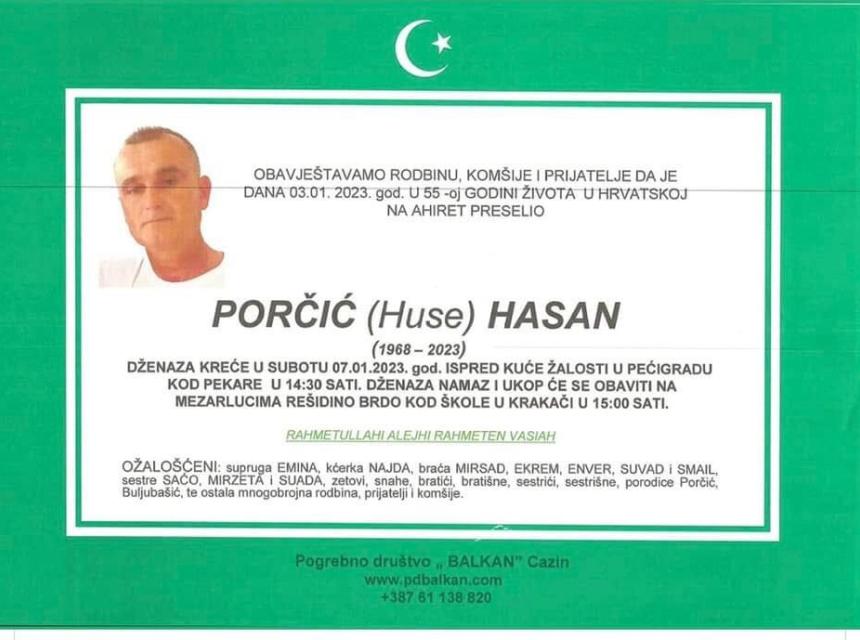 Tužnog srca i s bolom u duši obavještavamo rodbinu, komšije i prijatelje da je naš dragi Porčić (Huse) Hasan u 55-oj godini života, preselio na Ahiret.