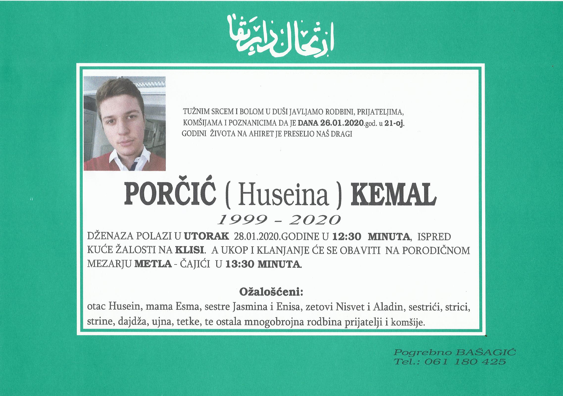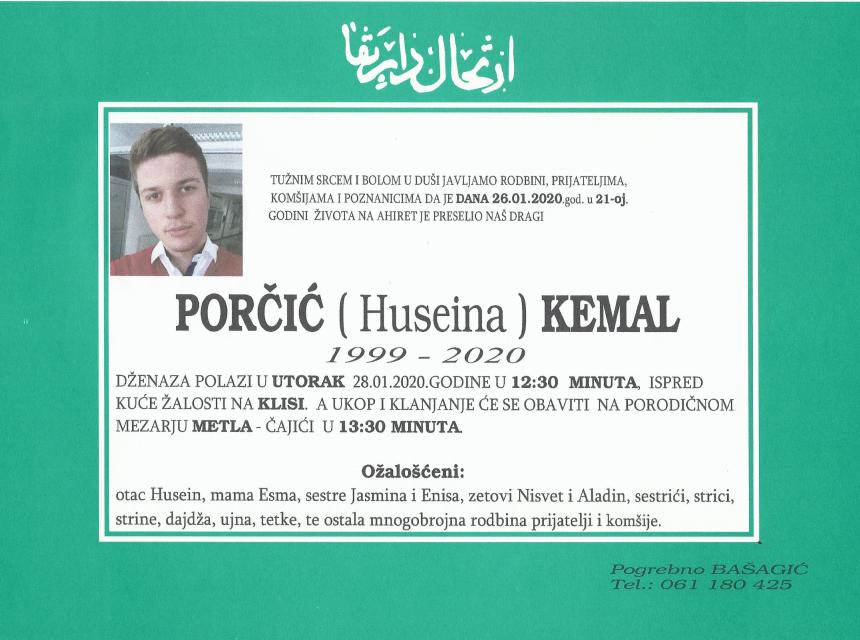 Tužnim srcem i bolom u duši javljamo rodbini i prijateljima da je dana 26.01.2020. godine u 21-oj godini života, na Ahiret preselio Porčić (Huseina) Kemal.