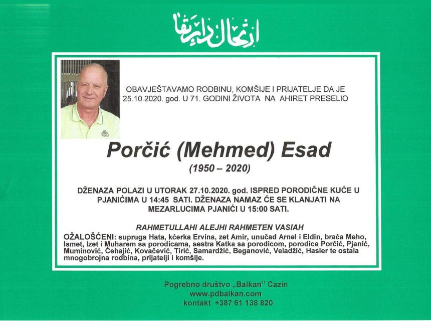 Tužnog srca i s bolom u duši obavještavamo rodbinu, komšije i prijatelje da je naš dragi Porčić (Mehmed) Esad 25. oktobra 2020. godine, u 71. godini života, preselilo na Ahiret.