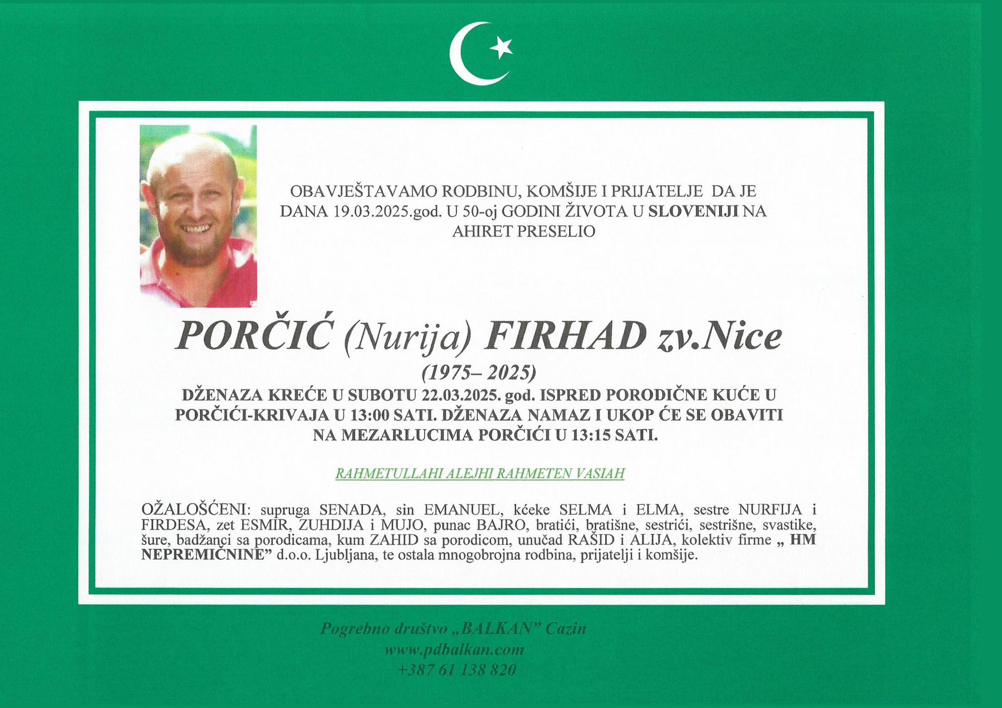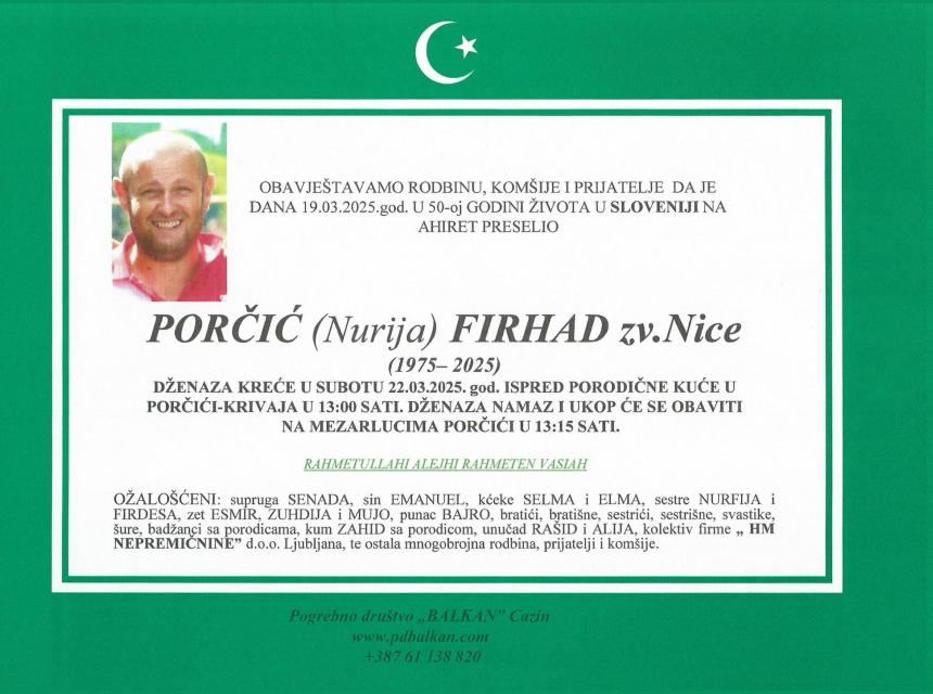 Tužna srca i s bolom u dušu obavještavamo da je preselio Porčić (Nurija) Firhad zv. Nice na ahiret dana 19.03.2025. godine u 50oj godini života.