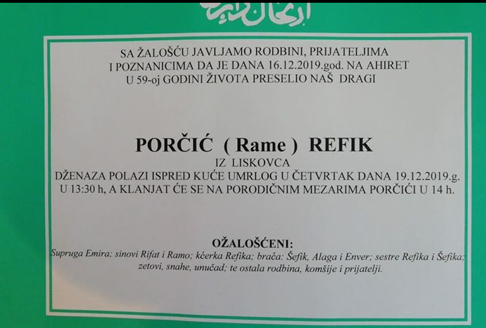 Dženaza polazi ispred kuće umrlog u čtvrtak 19.12.2019.godine u 13:30h, a klanjati će se na porodičnom mezarju Porčiči u 14:00h