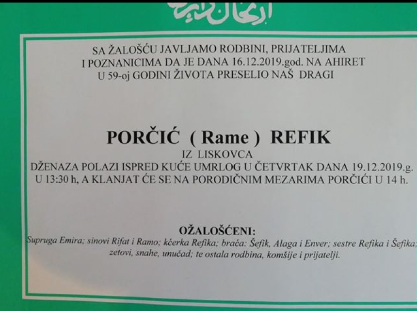 Tužnim srcem obaviještavamo rodbinu, prijatelje i poznanike da je naš dragi Porčić (Rame) Refik dana 16.12.2019. godine u 50-oj godini života na Ahiret preselio.