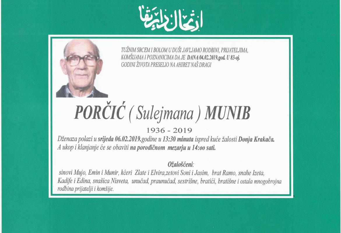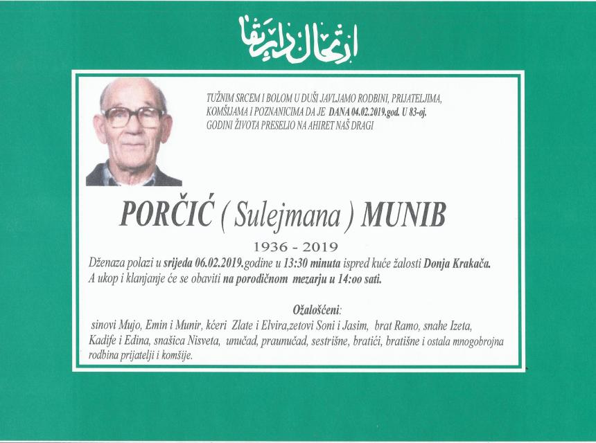 Tužnim srcem i bolom u duši javljamo rodbini, prijateljima, komšijama i poznanicima da je danas 04.02.2019. godine u 83.-oj godini života na Ahiret preselio naš dragi Porčić (Sulejmana) Munib. Dženaza polazi u srijedu 06.02.2019. godine u 13:30 minuta ispred kuće žalosti Donja Krakača. A ukop i klanjanje će se obaviti na porodičnom mezarju u 14:00 sati.