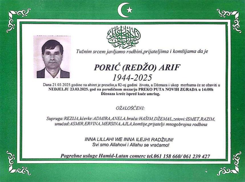 Tužna srca i s bolom u dušu obavlještavamo da je preselio Porić (Redžo) Arif na ahiret 21.03.2025. god. u 82. godini života.