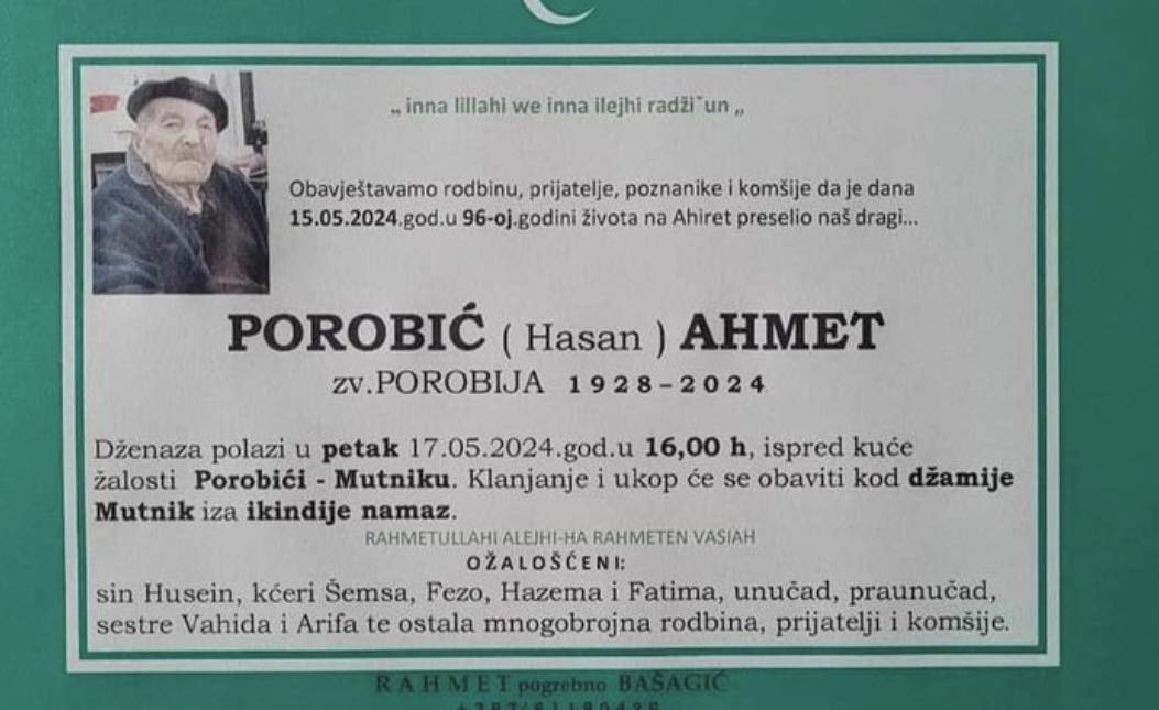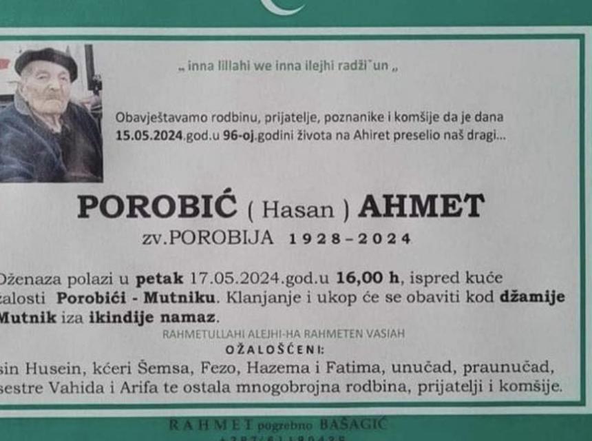 Dana 15.05.2024. godine u 96-oj godini života na ahiret je preselio Porobić (Hasan) Ahmet.