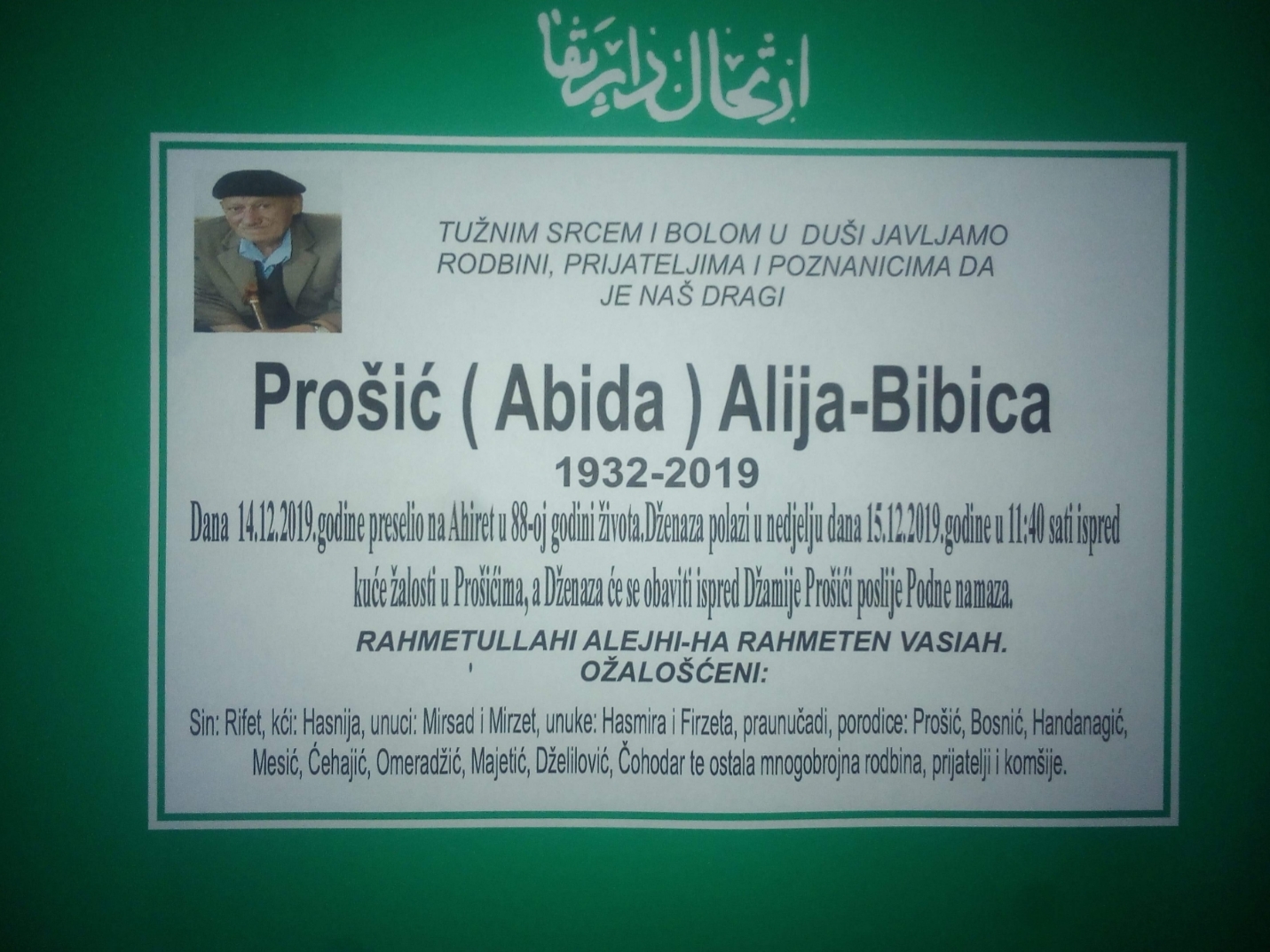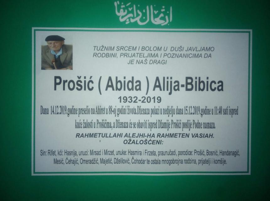 Tužnim srcem i bolom u duši javljamo rodbini i prijateljima da je dana 14.12.2019. godine u 88-oj godini života, na Ahiret preselio Prošić (Abida) Alija-Bibica
