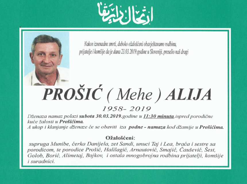 Nakon iznenadne smrti, duboko ožalošćeni obavještavamo rodbinu, prijatelje i komšije da je dana 23.03.2019. godine u Sloveniji preselio naš dragi Prošić (Mehe) Alija.