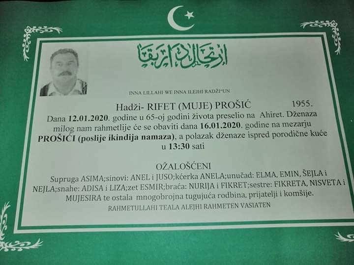 Tužnim srcem i bolom u duši javljamo rodbini i prijateljima da je dana 12.01.2020. godine u 65. godini života na Ahiret preselio Prošić (Muje) hadži-Rifet.