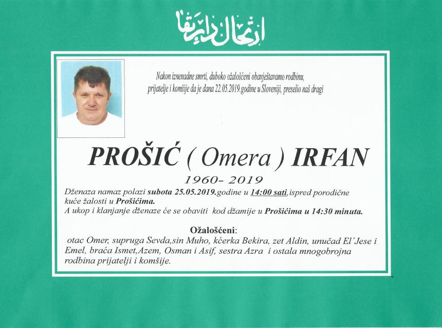Obavještavamo rodbinu, komšije i prijatelje da je dana 22. 05. 2019. godine u Sloveniji na Ahiret preselio Prošić (Omera) Irfan.
