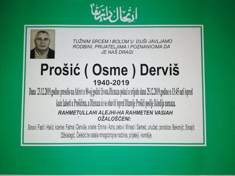 Tužnim srcem i s bolom u duši javljamo rodbini, prijateljima i komšijama da je 23.12.2019. godine u 80. godini života, na Ahiret preselio Prošić (Osme) Derviš.