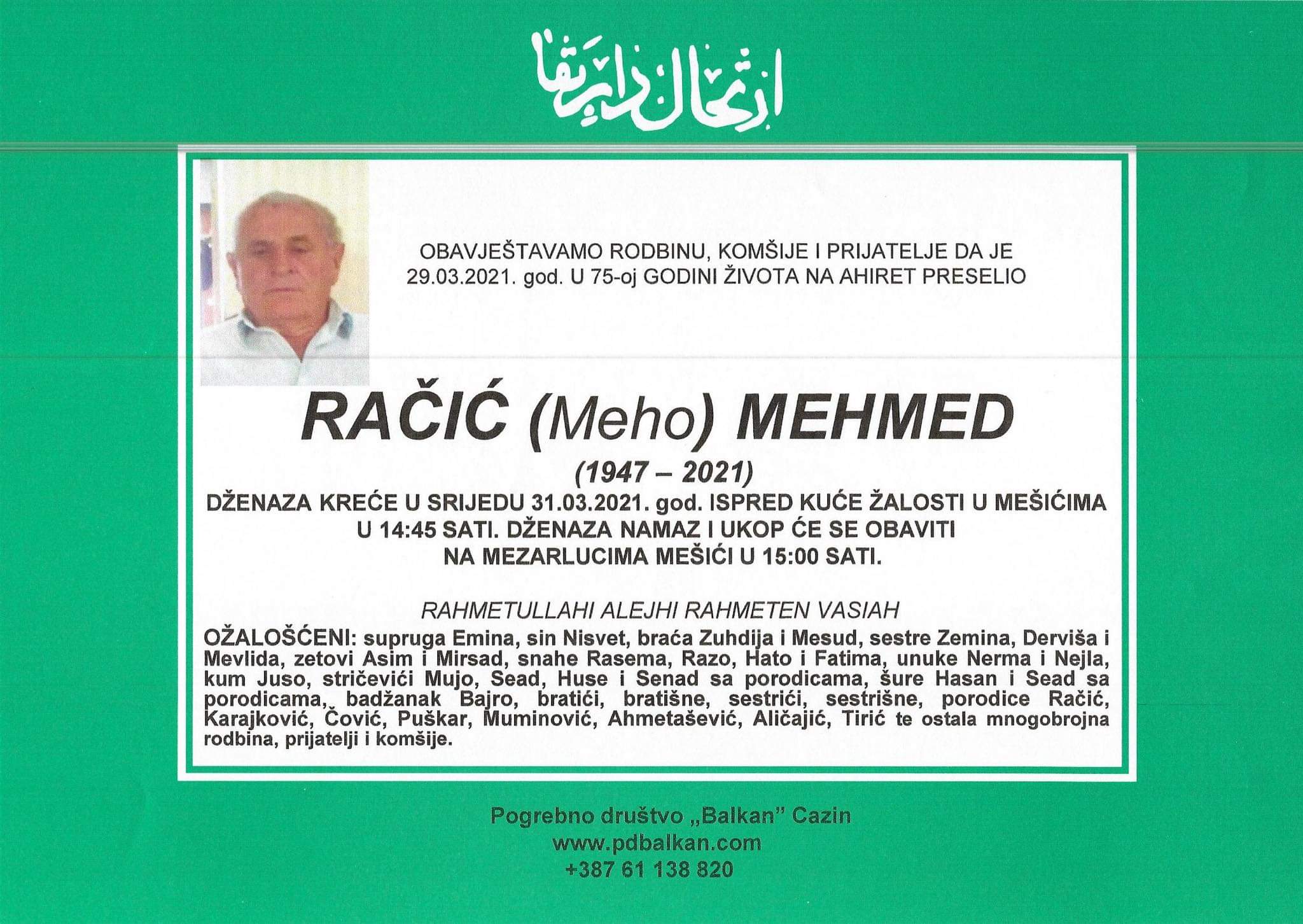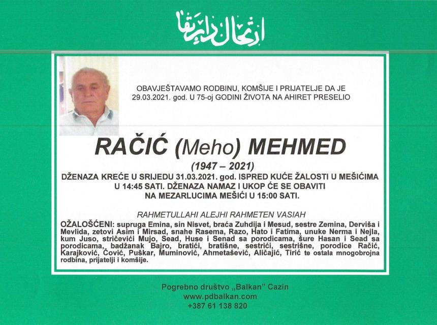 Tužnog srca i s bolom u duši obavještavamo rodbinu, komšije i prijatelje da je naš dragi Račić (Meho) Mehmed, dana 29.03.2021 godine, u 75-oj godini života, preselio na Ahiret.