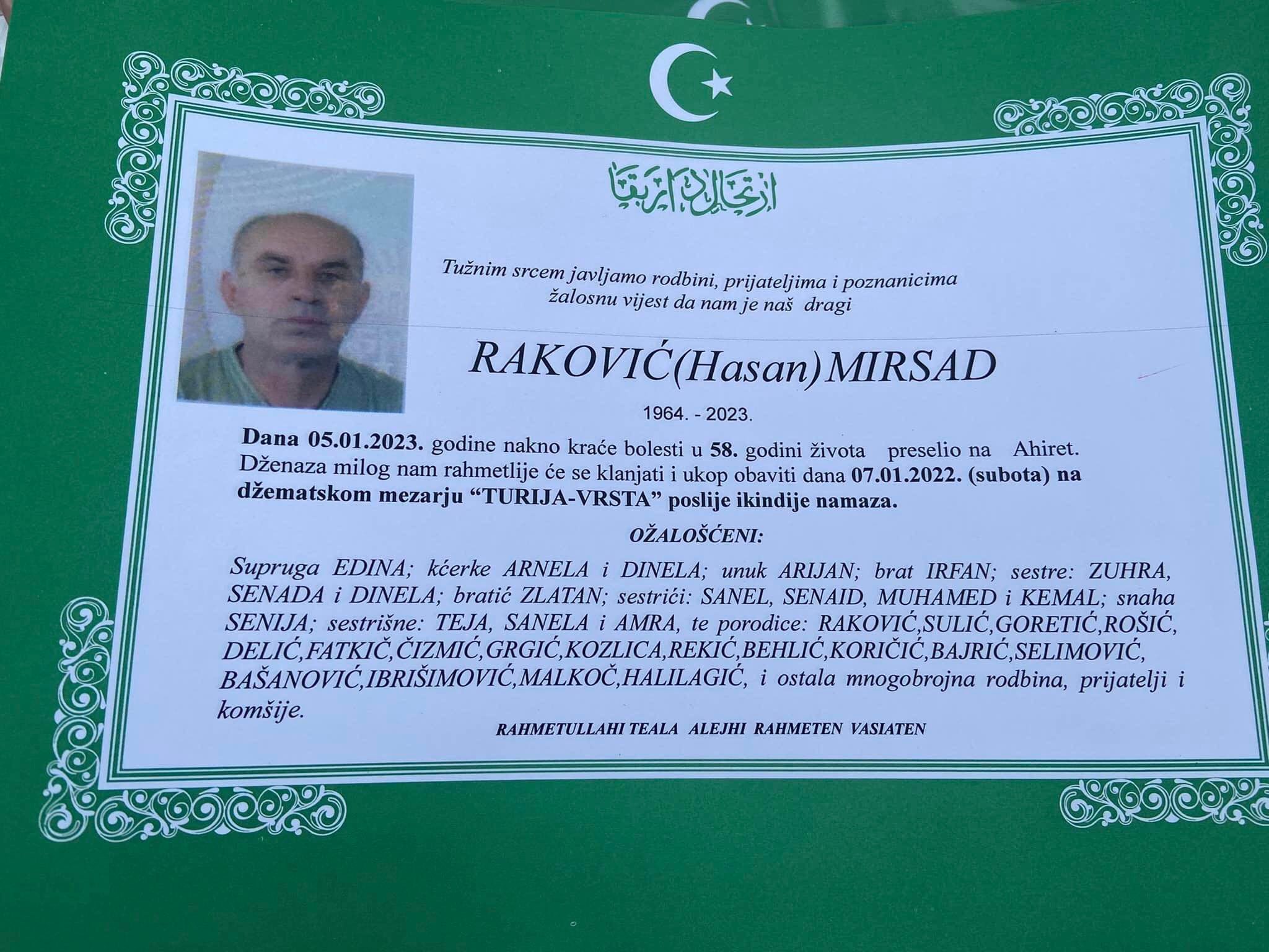 Tužnog srca i s bolom u duši obavještavamo rodbinu, komšije i prijatelje da je naš dragi Raković (Hasan) Mirsad 58. godini života preselio na Ahiret.