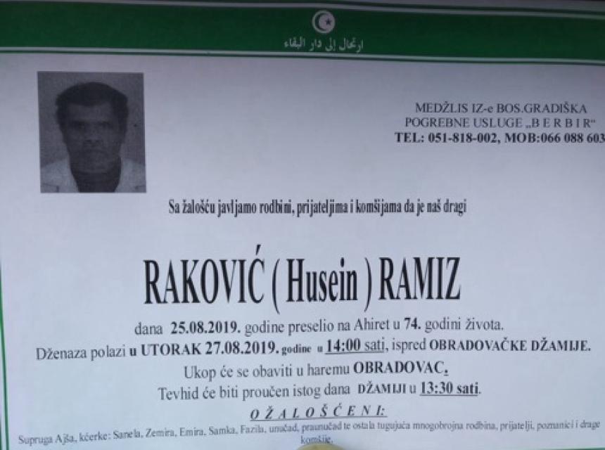 Sa žalošću javljamo rodbini, prijateljima i komšijama da je naš dragi Raković (Husein) Ramiz dana 25. 08.2019.godine preselio na Ahiret u 74.godini života. Dženaza polazi u utorak 27.08.2019. u 14:00 sati, ispred Obradovačke džamije. Ukop će se obaviti u haremu Obradovac. Tevhid će biti proučen istog dana u džamiji u 13:30 sati.