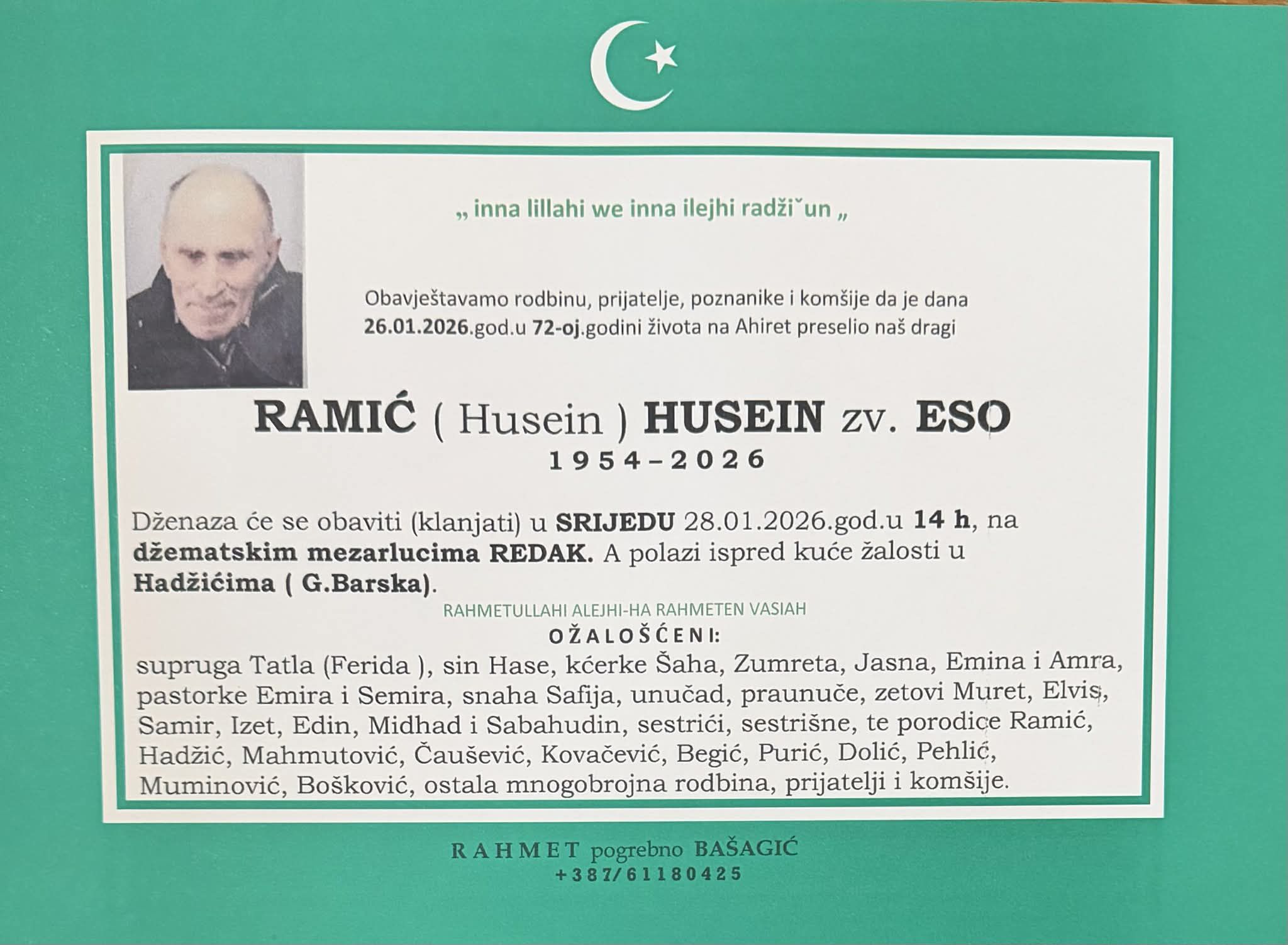 Dženaza će se obaviti (klanjati) u SRIJEDU 28.01.2026.god.u 14 h, na džematskim mezarlucima REDAK. A polazi ispred kuće žalosti u Hadžićima (G.Barska).