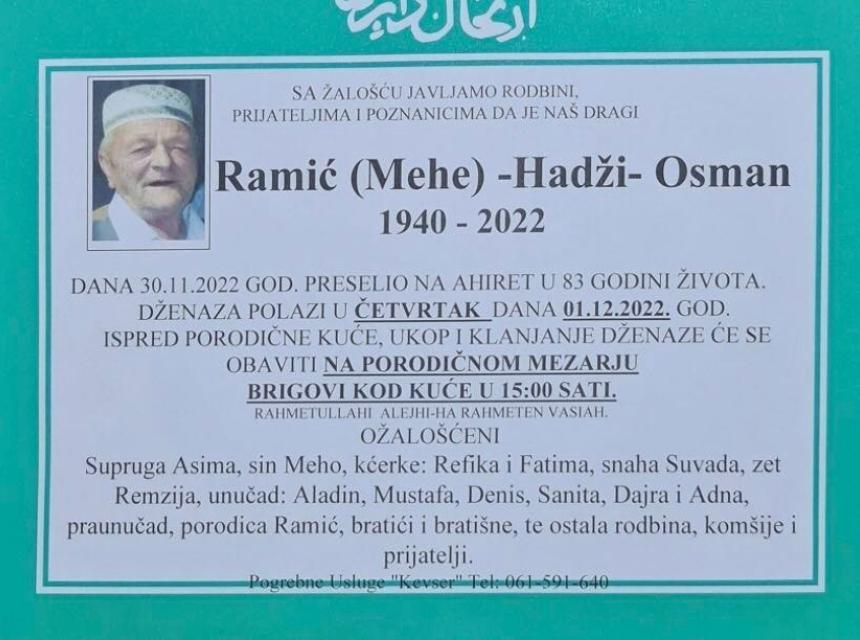 Tužnog srca i s bolom u duši obavještavamo rodbinu, komšije i prijatelje da je naš dragi Ramić (Mehe) Hadži- Osman 83. godini života preselio na Ahiret.