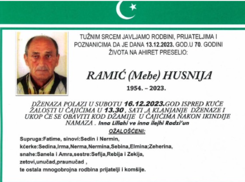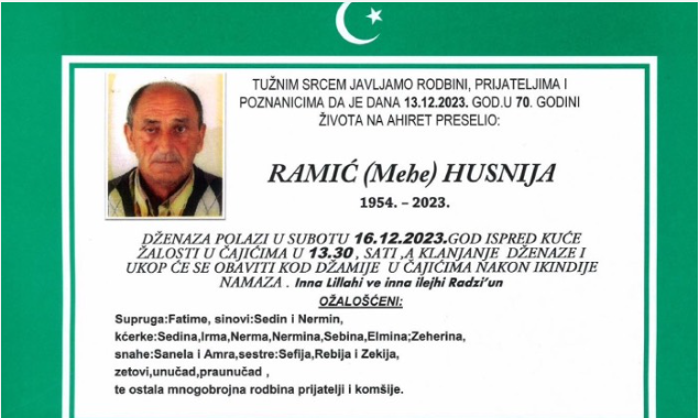 TUŽNIM SRCEM JAVLJAMO RODBINI, PRIJATELJIMA I POZNANICIMA DA JE DANA 13.12.2023. GOD.U 70. GODINI ŽIVOTA NA AHIRET PRESELIO RAMIĆ (Mehe) HUSNIJA.