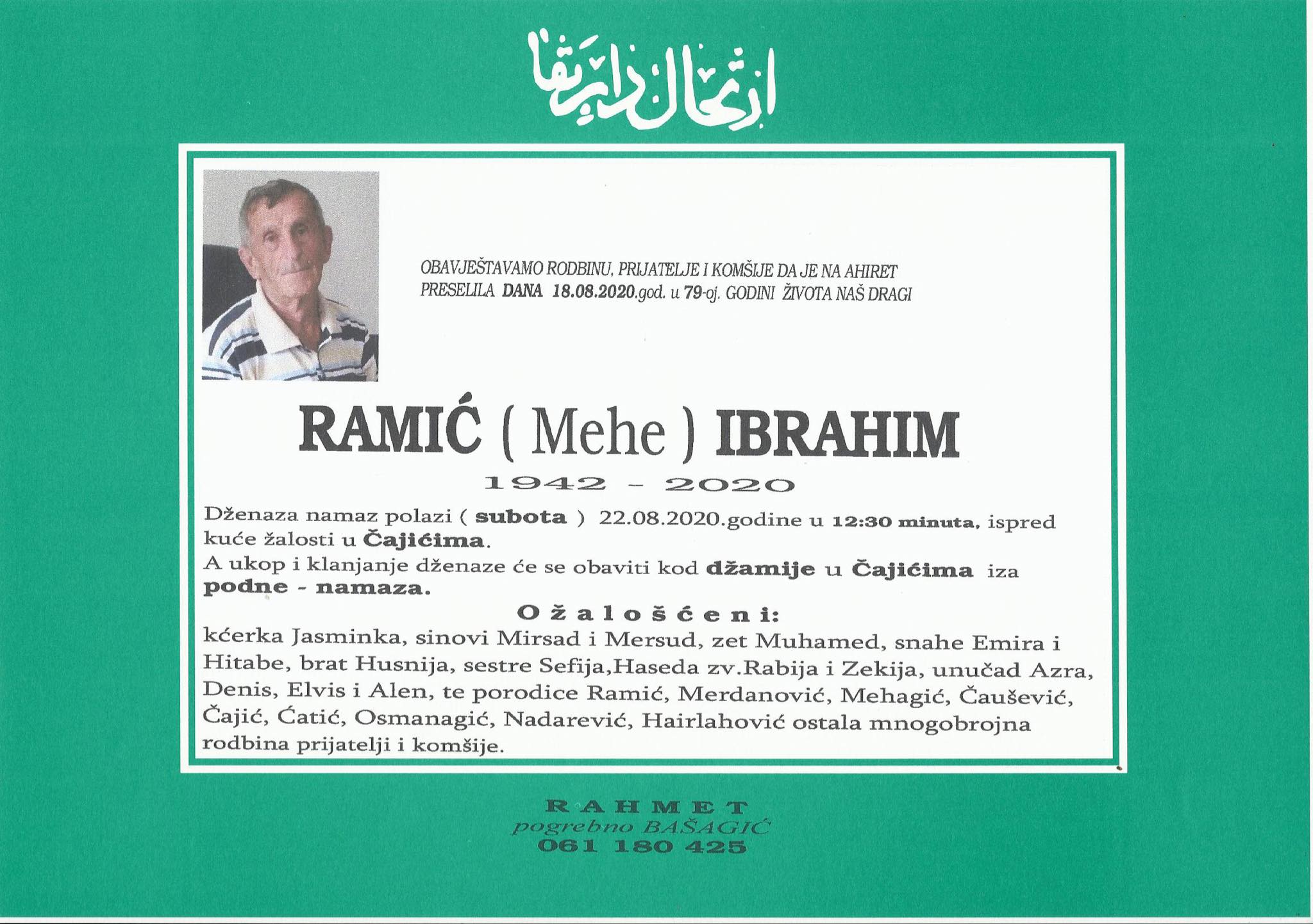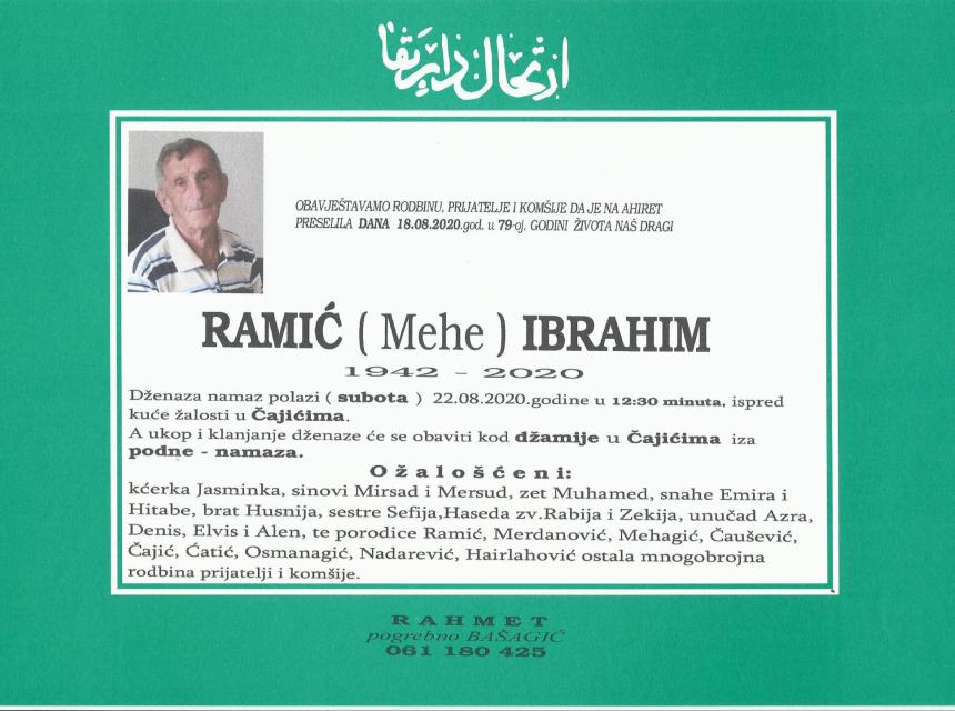 Tužnog srca i s bolom u duši obavještavamo rodbinu, komšije i prijatelje da je naš dragi Ramić (Mehe) Ibrahim, dana 18.08.2020. godine, u 79-oj. godini života, preselio na Ahiret.