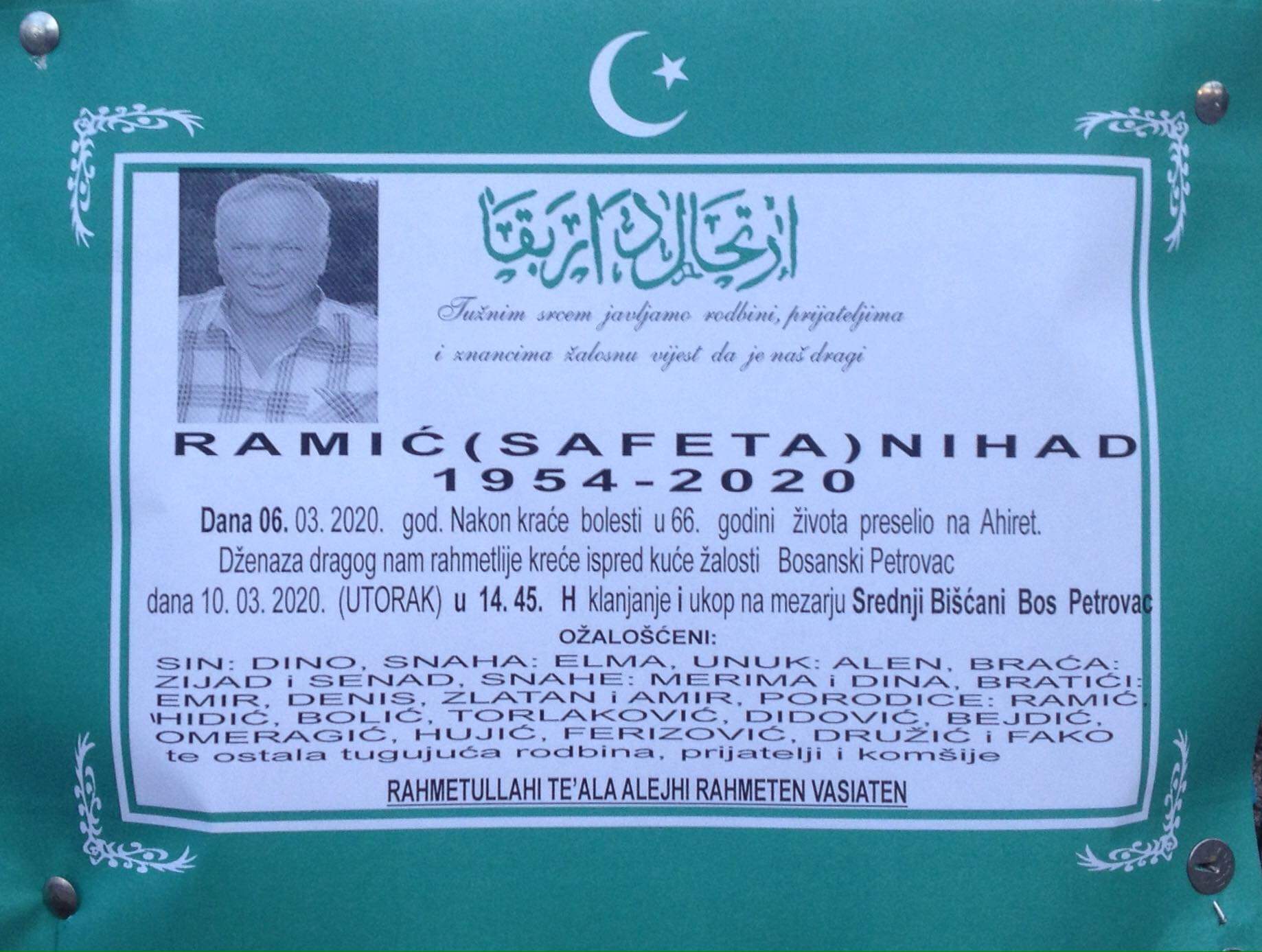 Teškim srcem i bolom u duši javljamo da je naš dragi i nikad prežaljeni Ramić (Safeta) Nihad dana 06.03.2020.godine u 66-toj godini života nakon kraće bolesti preselio na Ahiret.