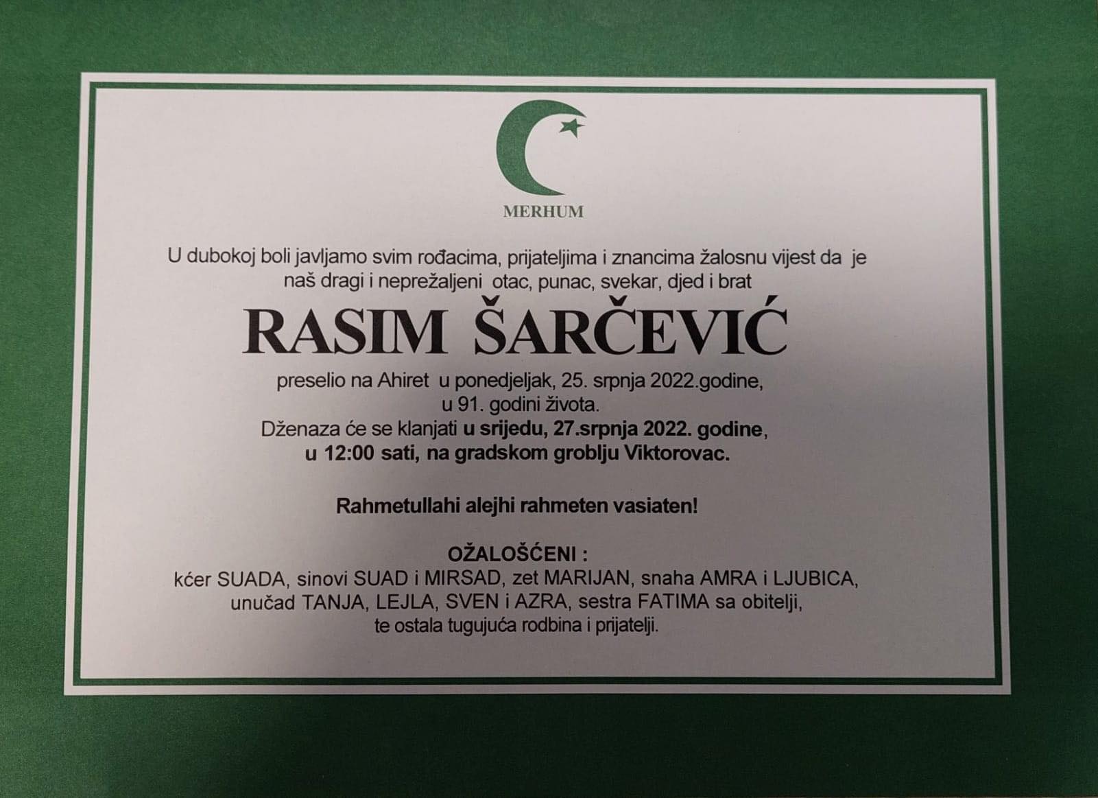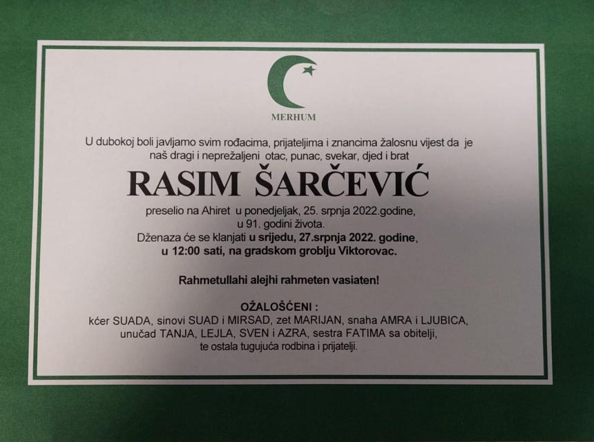 Dženaza namaz klanjat će se 27.07.2022. god. u 12:00h na gradskom groblju Viktorovac.