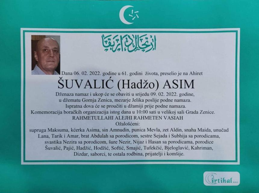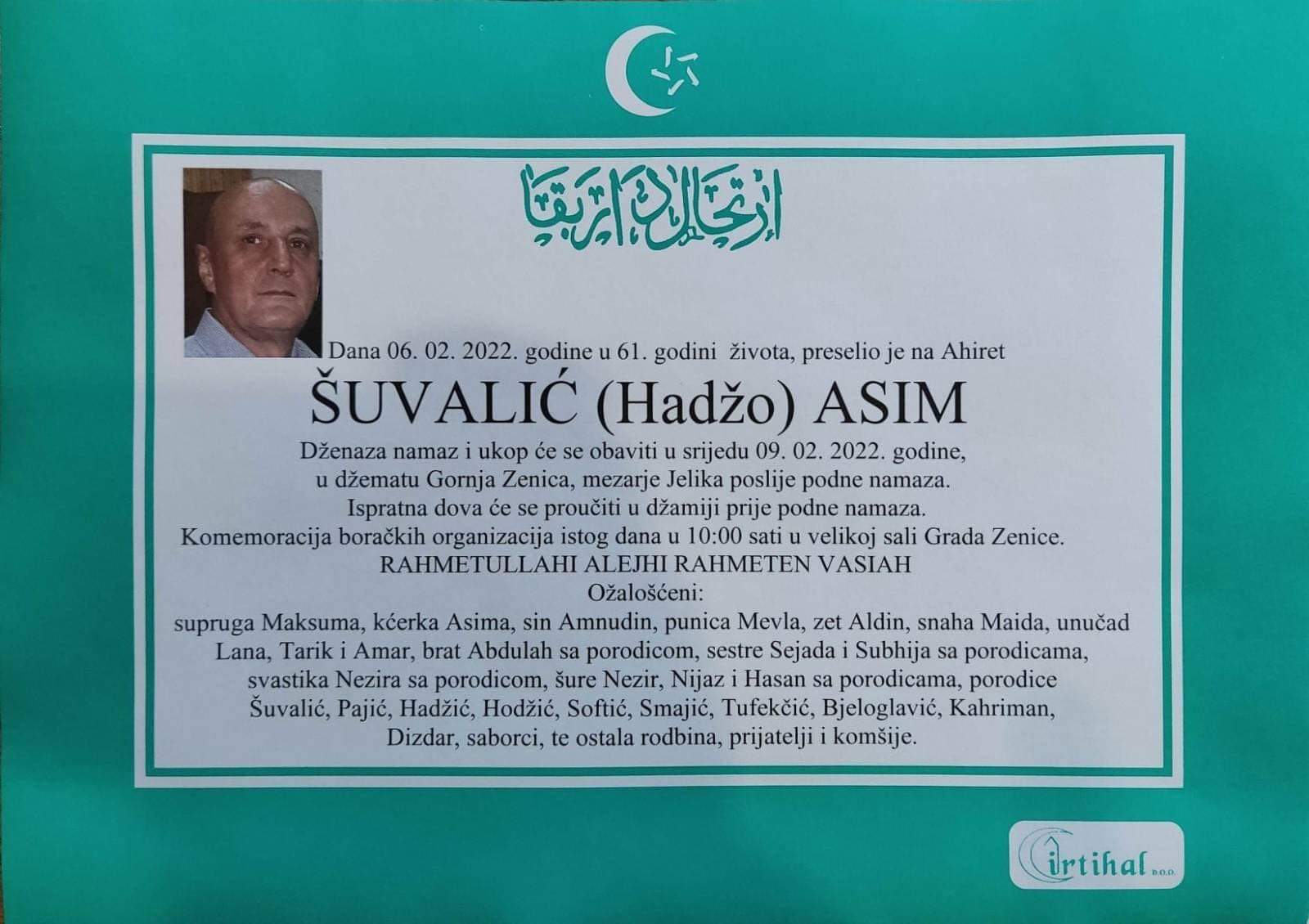 Tužnog srca i s bolom u duši obavještavamo rodbinu, komšije i prijatelje da je naš dragi Asim Šuvalić 06.02.2022. u 61. godini života preselio na ahiret.