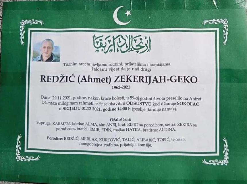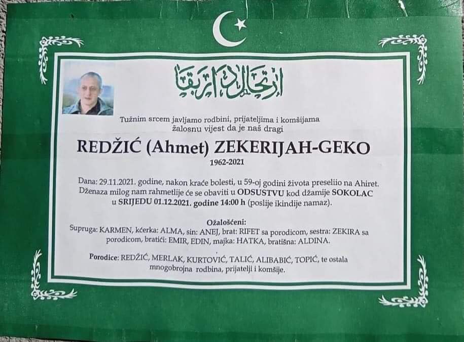 Tužnog srca i s bolom u duši obavještavamo rodbinu, komšije i prijatelje da je naš dragi Redžić (Ahmet) Zekerijah-Geko dana 29.11.2021. u 59. godini života preselio na ahiret.
