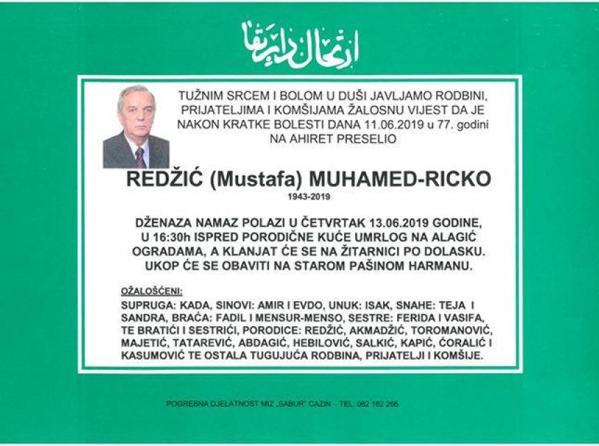 Tužnim srcem i bolom u duši, javljamo rodbini, prijateljima i poznanicima da je naš dragi Redžić (Mustafa) Muhamed - Ricko dana 11.06.2019.godine. preselio na Ahiret u 77-oj godini života.
