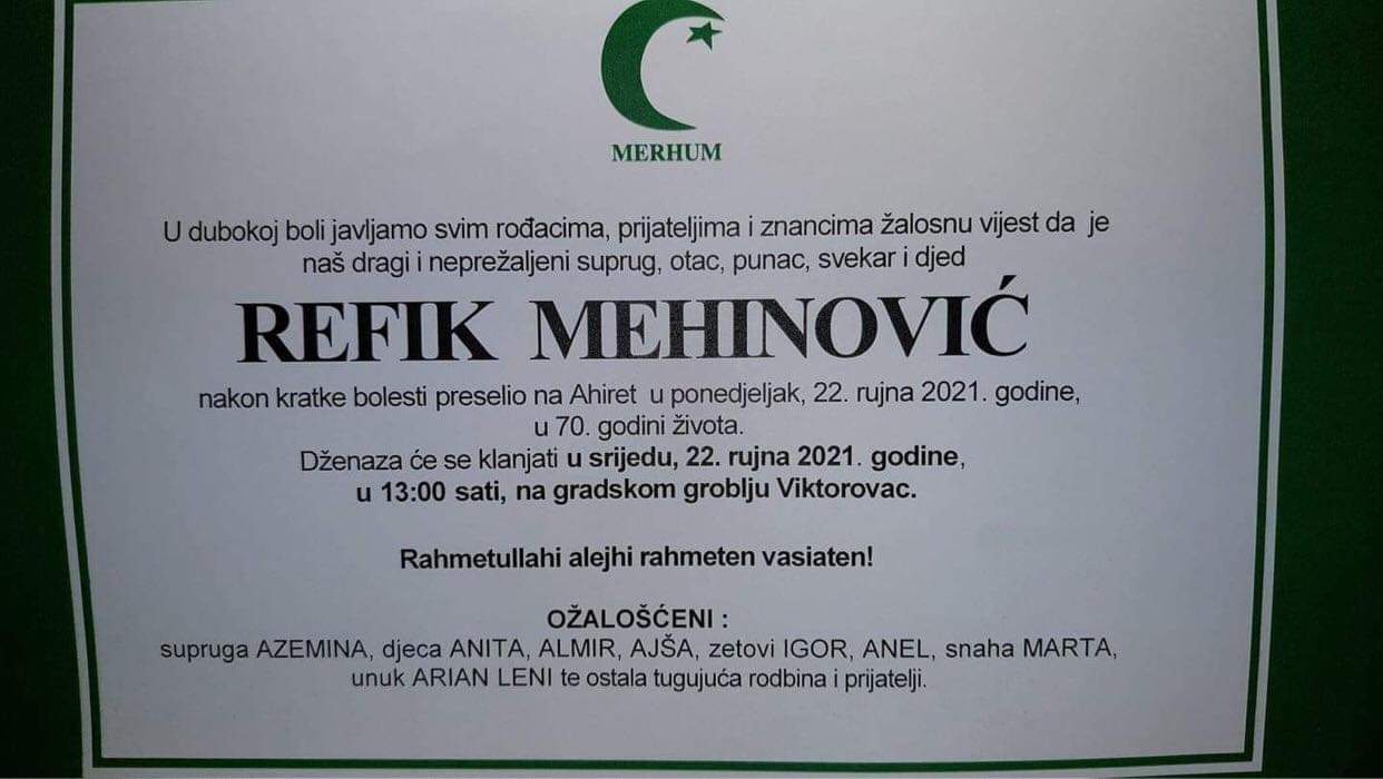 Tužnog srca i s bolom u duši obavještavamo rodbinu, komšije i prijatelje da je naš dragi Refik Mehinović, dana 20.09.2021. godine, u 70-oj godini života preselio na ahiret.