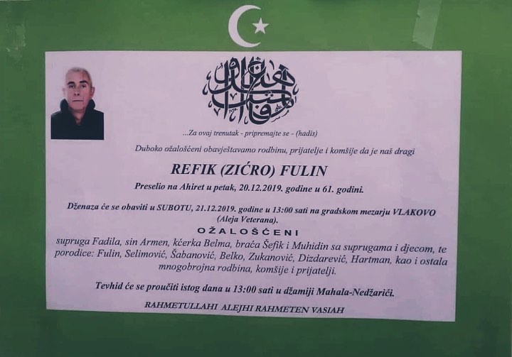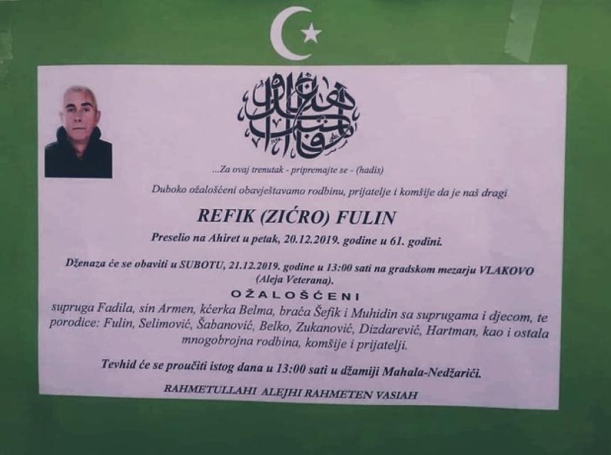 Duboko ožalošćeni obavještavamo rodbinu, prijatelje, saborce i komšije da je naš dragi Refik (Zićro) Fulin preselio na Ahiret u petak, 20.12.2019. godine u 61. godini života.