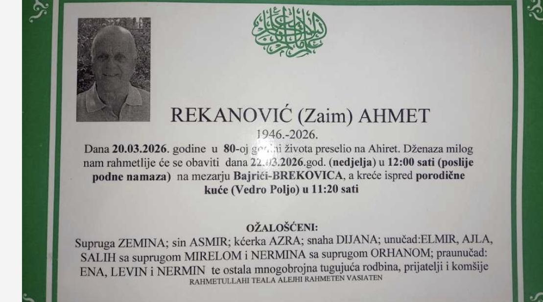 Dženaza milog nam rahmetlije će se obaviti dana 22.03.2026. godine (nedjelja) u 12:00 sati (poslije podne namaza) na mezarju Bajrići – Brekovica, a kreće ispred porodične kuće (Vedro Polje) u 11:20 sati.