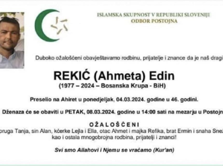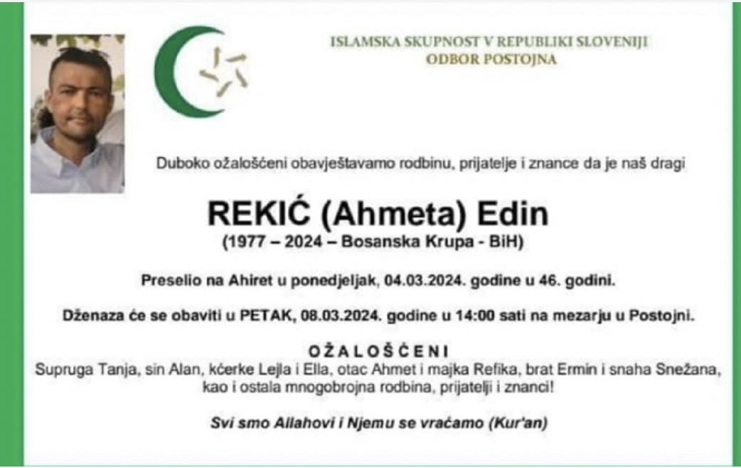 Dženaza će se obaviti u petak, 08.03.2024.god. u 14 sati na mezarju u Postojni.