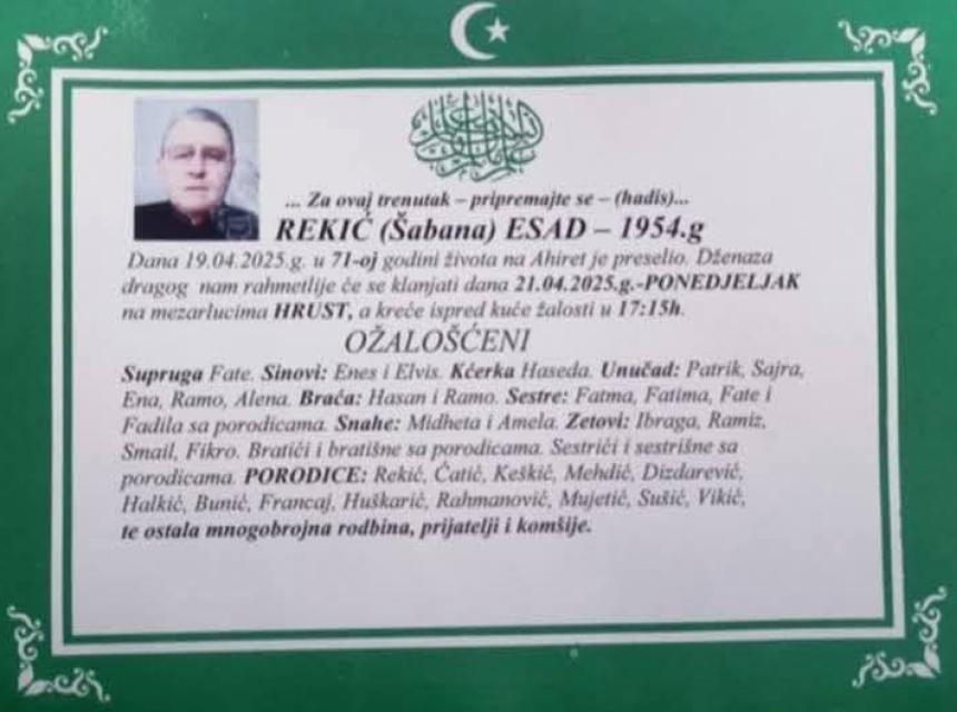 Dana 19.04.2025.g. u 71-oj godini života na ahiret je preselio. Dženaza dragog nam rahmetlije će se klanjati dana 21.04.2025.g. - PONEDELJAK na mezarlucima HRUST, a kreće ispred kuće žalosti u 17:15h.