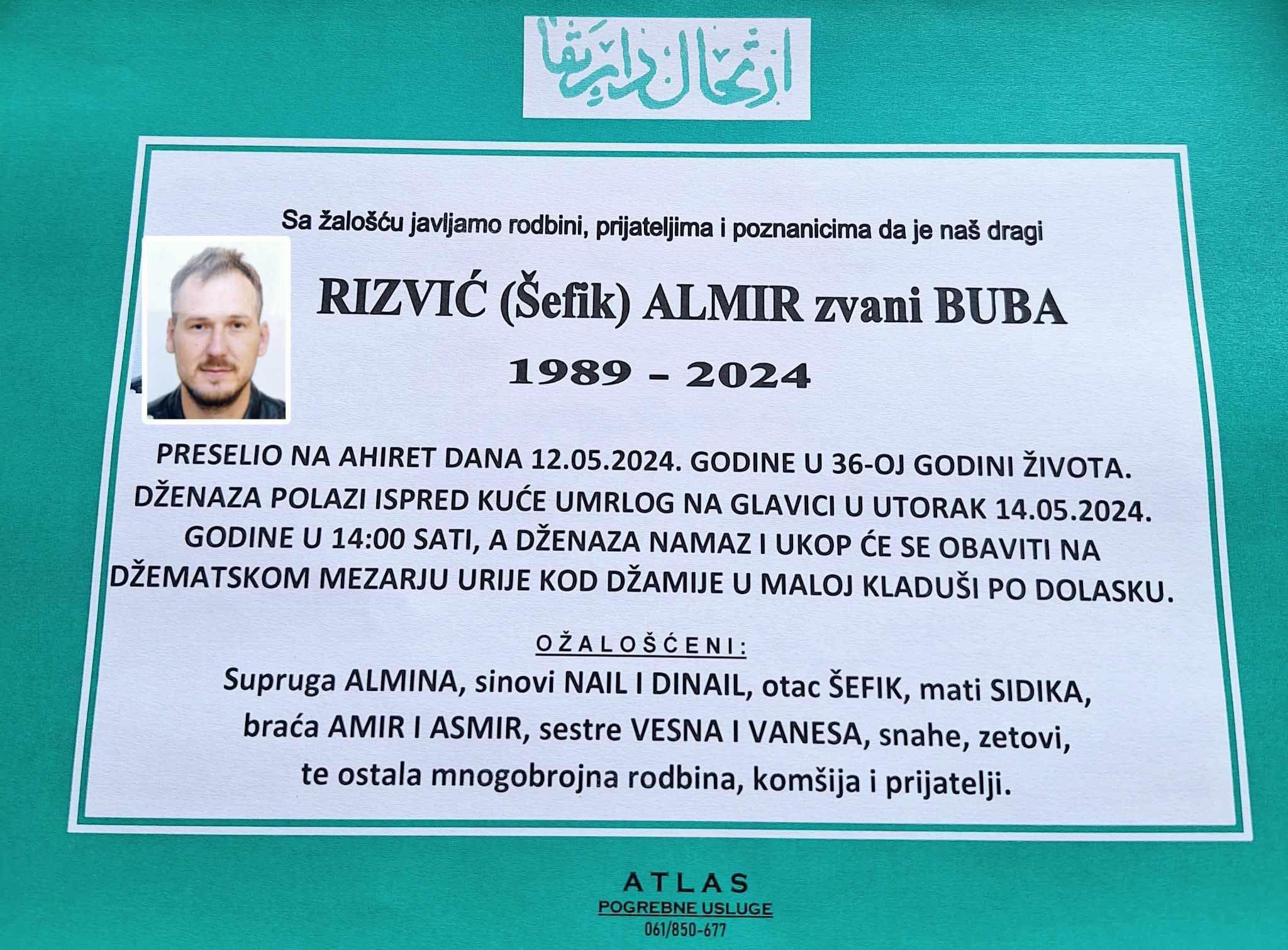 Tužnim srcem javljamo rodbini, prijateljima i komšijama žalosnu vijest da nam je naš dragi Rizvić (Šefik) Almir zvani Buba dana 12.05.2024. godine u 36-oj godini života preselio na ahiret.