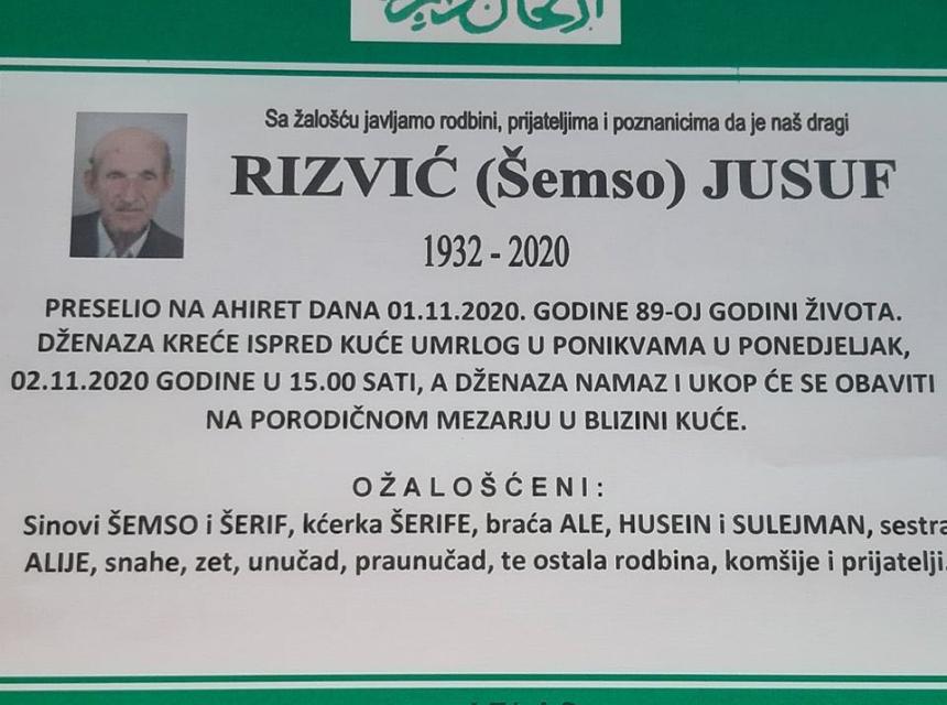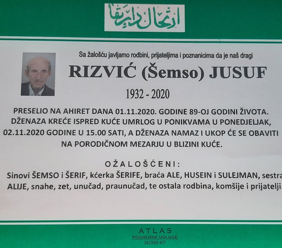 Tužnog srca i s bolom u duši obavještavamo rodbinu, komšije i prijatelje da je naš dragi Rizvić (Šemso) Jusuf 1. Novembra 2020. godine, u 89. godini života, preselio na Ahiret.
