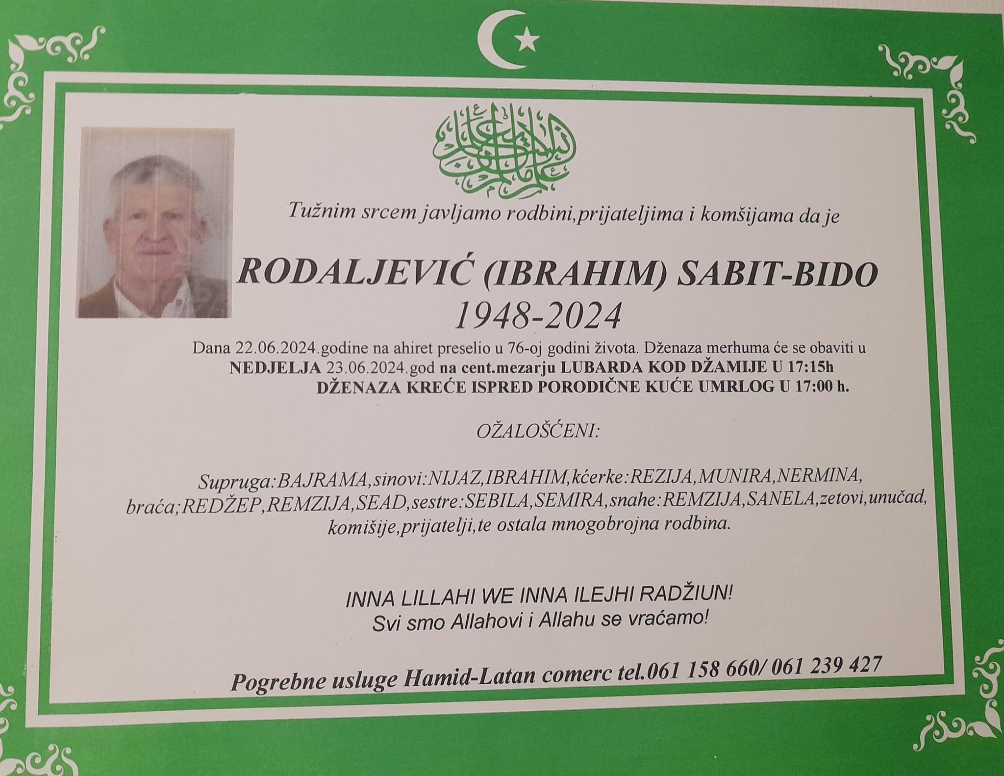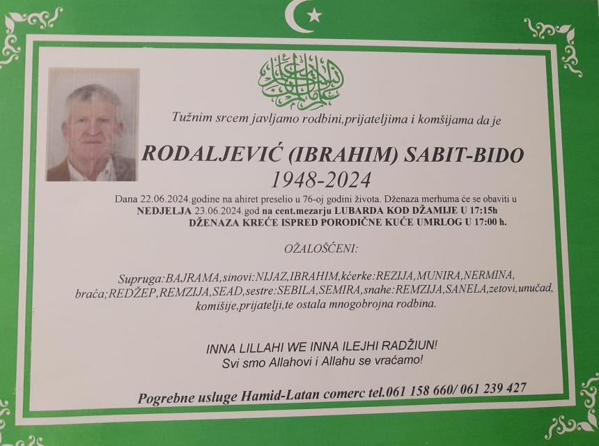 Tužnim srcem i bolom u duši javljamo rodbini, prijateljima i komšijama da je naš dragi Rodaljević (Ibrahim) Sabit - Bido, dana 22.06.2024. godine u 76-oj godini života, preselio na Ahiret.