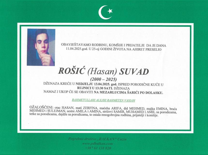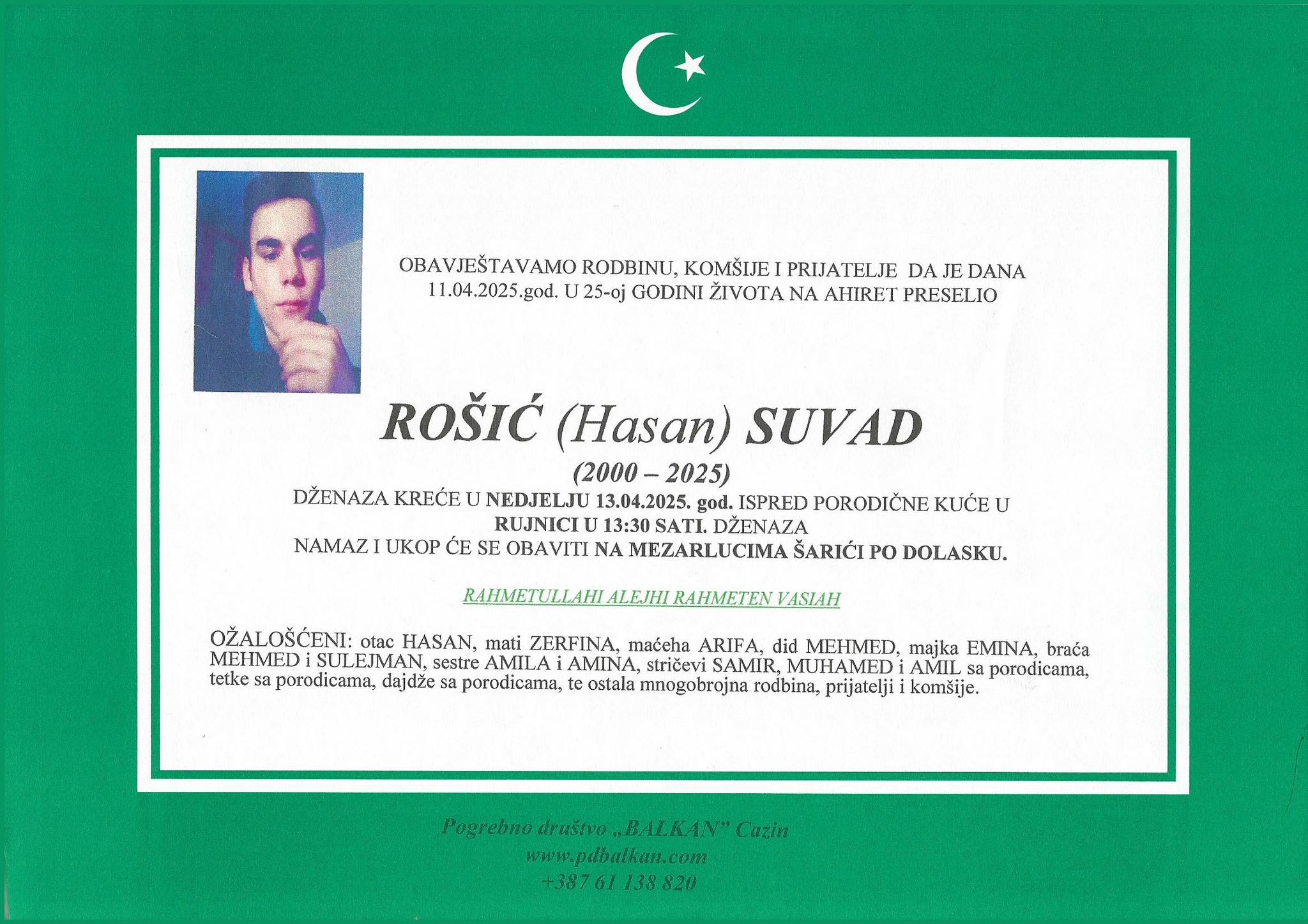 Tužnim srcem javljamo rodbini, prijateljima i komšijama da je dana 11.04.2025. godine na ahiret preselio Rošić (Hasan) Suvad u 25-oj godini života.