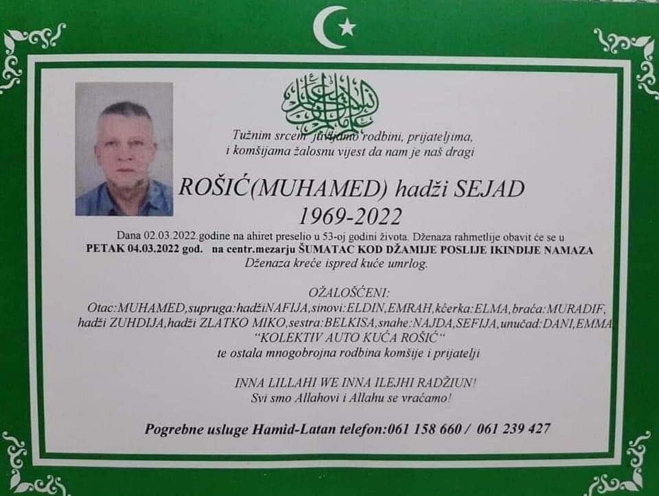 Tužnog srca i s bolom u duši obavještavamo rodbinu, komšije i prijatelje da je naš dragi Rošić (Muhamed) hadži Sejad 02.03.2022. u 53. godini života preselio na Ahiret.