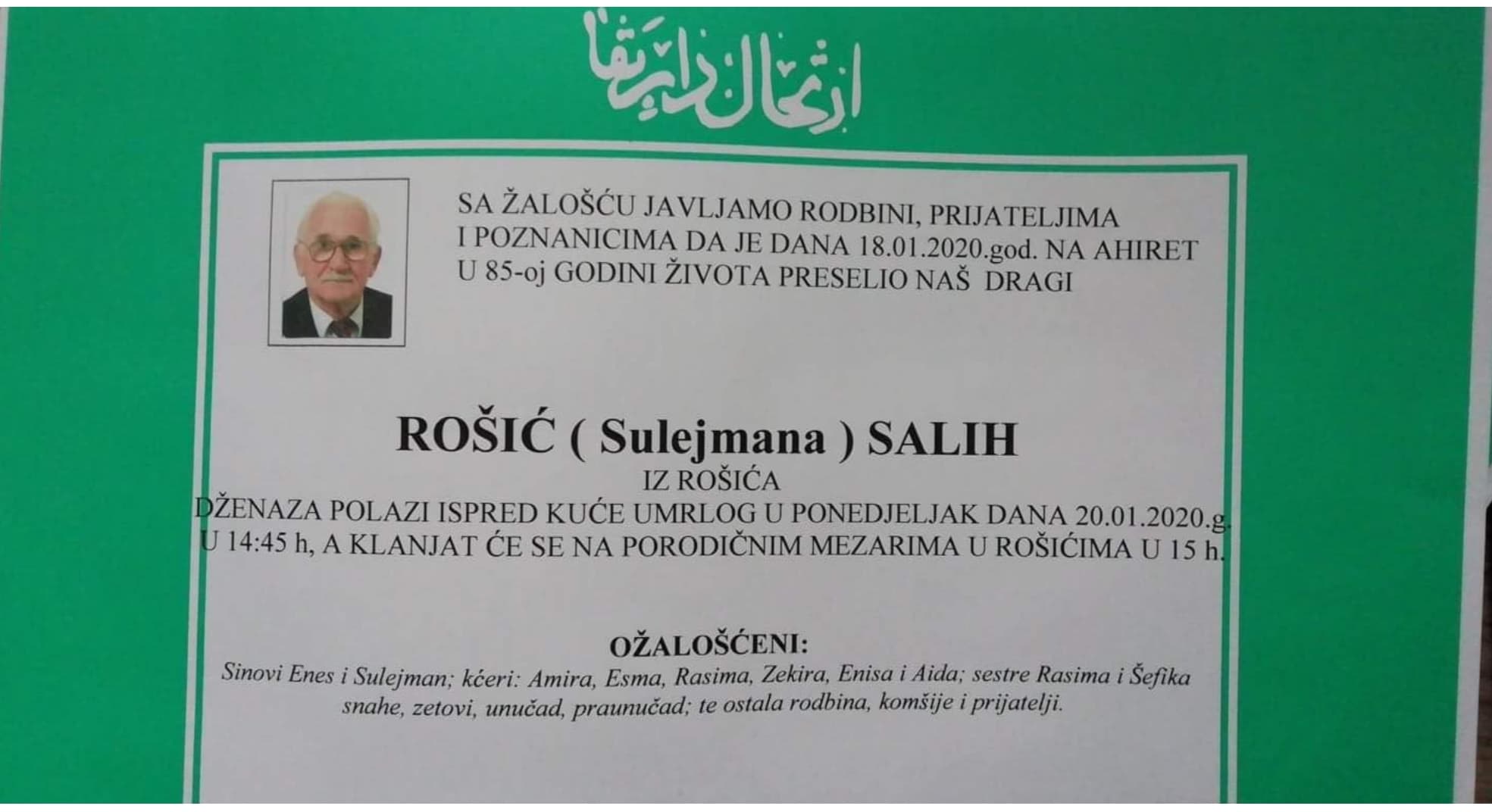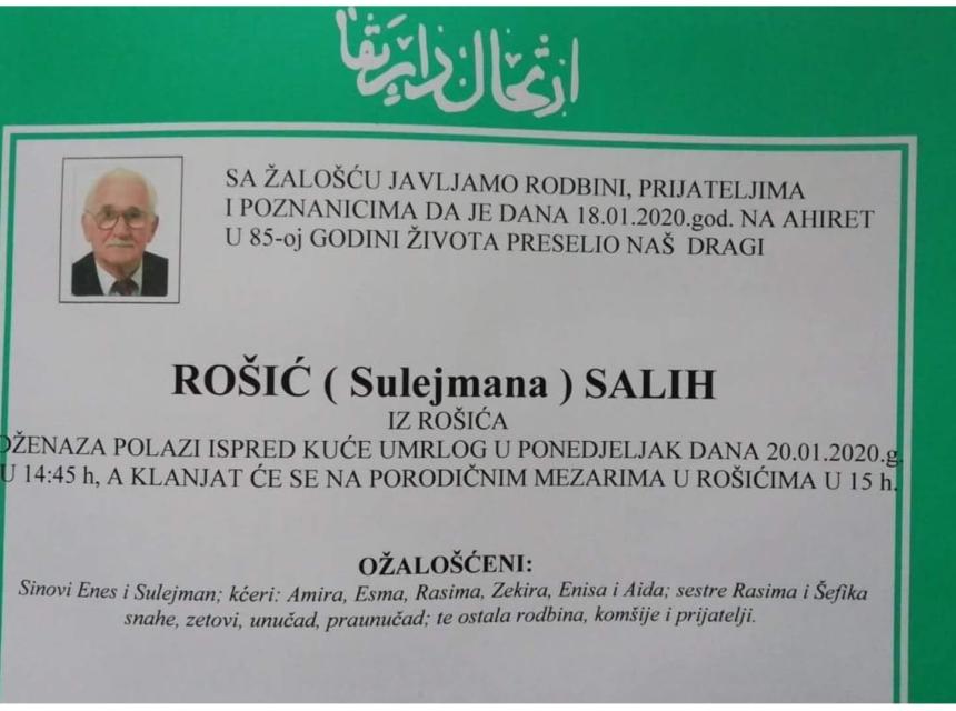 Tužnim srcem i bolom u duši javljamo rodbini i prijateljima da je naš dragi i nikad prežaljeni Rošić Salih dana 18.01.2020. godine u 85-toj godini života preselio na Ahiret.