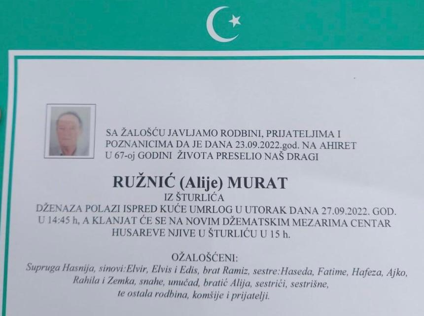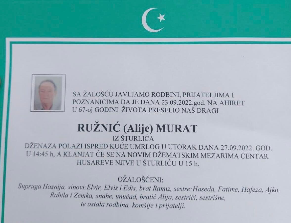 Sa žalošću javljamo rodbini, prijateljima i poznanicima da je dana 23.09.2022. godine na Ahiret u 67-oj godini života preselio naš dragi Ružnić (Alije) Murat iz Šturlića.