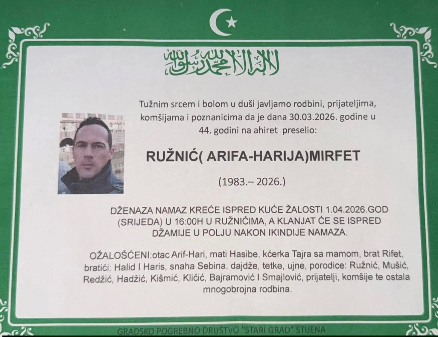 DŽENAZA NAMAZ KREĆE ISPRED KUĆE ŽALOSTI 1.04.2026.GOD (SRIJEDA) U 16:00H U RUŽNIĆIMA, A KLANJAT ĆE SE ISPRED DŽAMIJE U POLJU NAKON IKINDIJE NAMAZA.