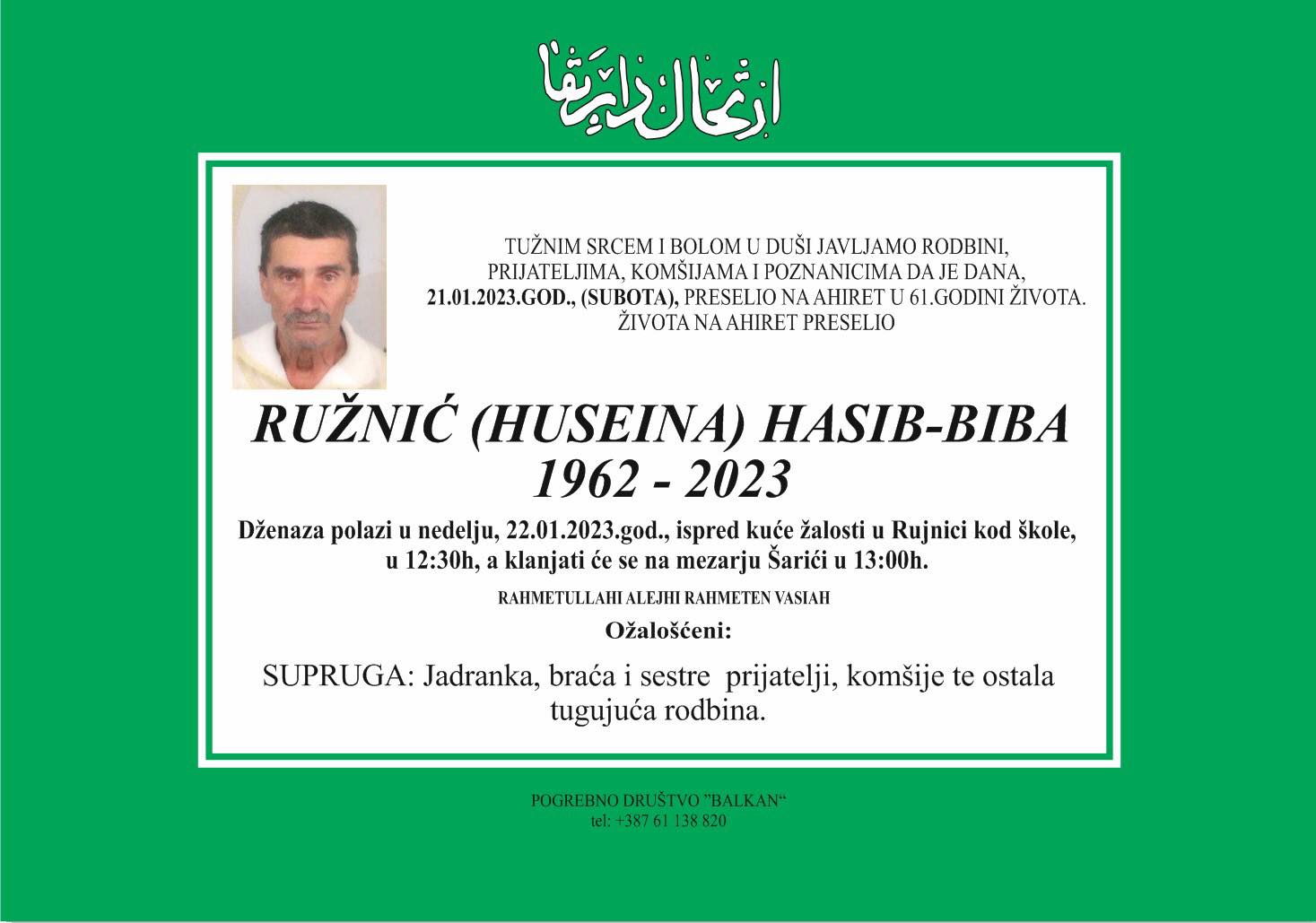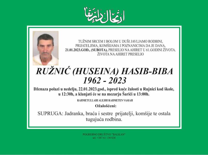 Tužnog srca i s bolom u duši obavještavamo rodbinu, komšije i prijatelje da je naš dragi Ružnić (Huseina) Hasib - Biba u 61-oj godini života, preselio na Ahiret.