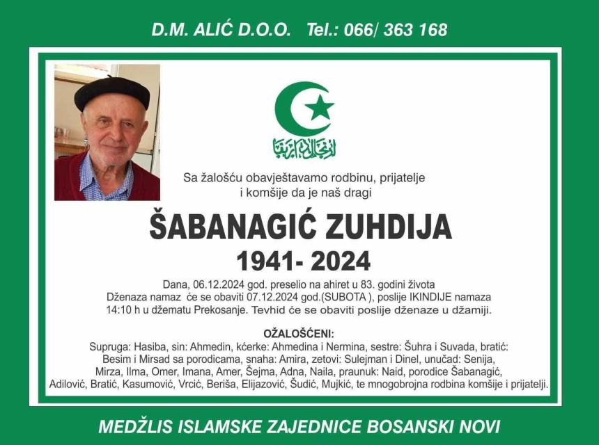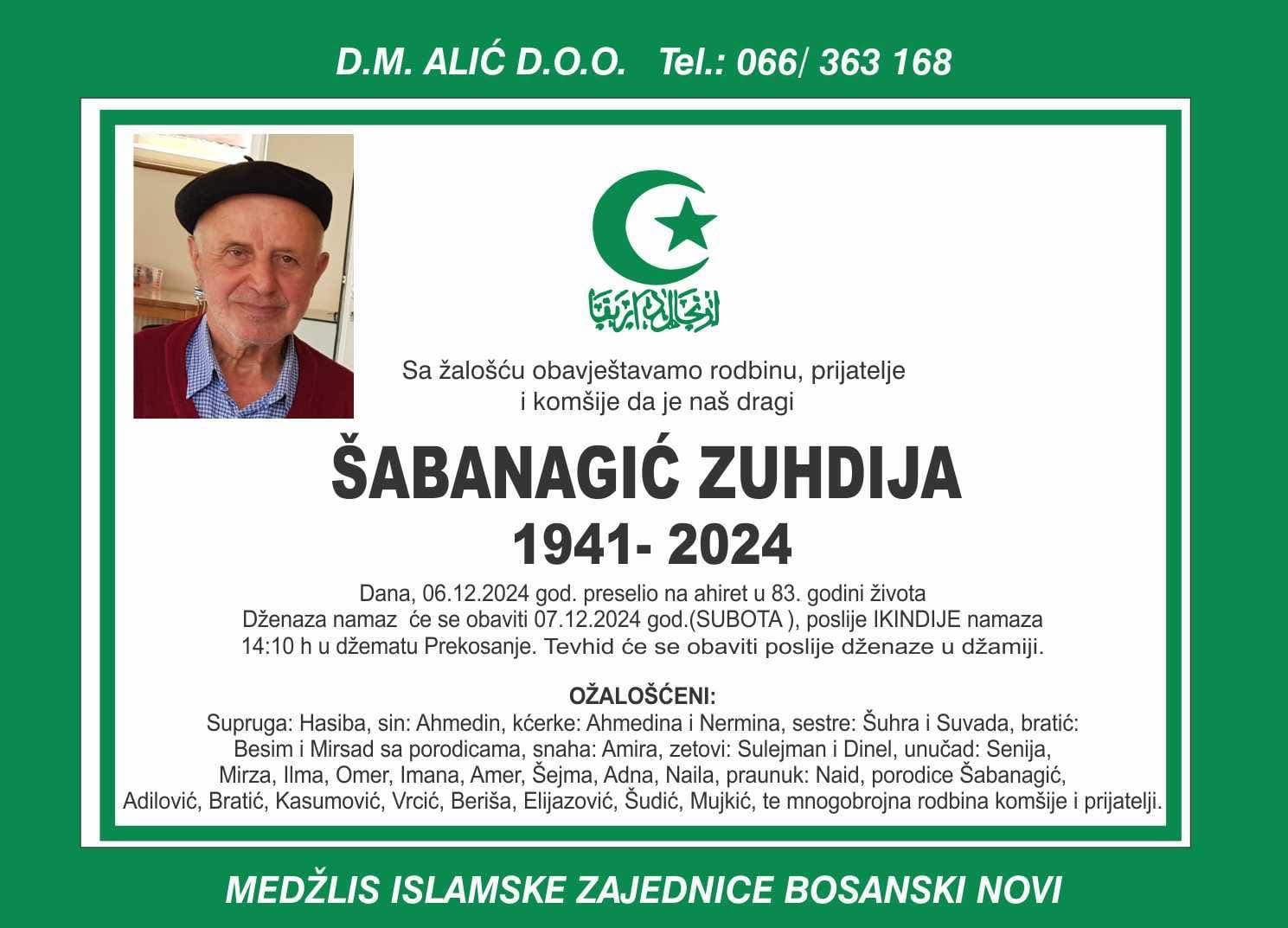Duboko ožalošćeni obavještavamo rodbinu, prijatelje i komšije da je dana 06.12.2024. god. u 83-oj godini života na ahiret preselio Šabanagić Zuhdija.