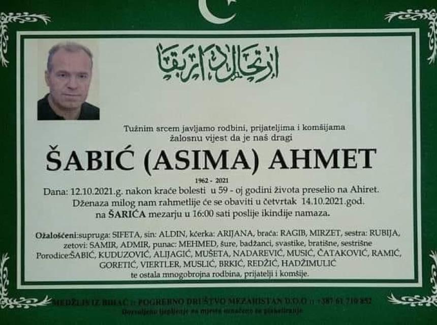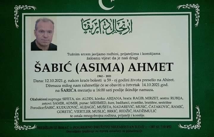 Tužnog srca i s bolom u duši obavještavamo rodbinu, komšije i prijatelje da je naš dragi Šabić (Asima) Ahmet, dana 12.10.2021 godine, u 59-oj godini života, preselio na Ahiret.