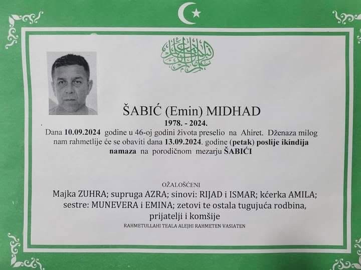 Tužnim srcem i bolom u duši javljamo rodbini, prijateljima i komšijama da je naš dragi Šabić (Emin) Midhad, dana 10.09.2024. godine u 46-oj godini života, preselio na Ahiret.